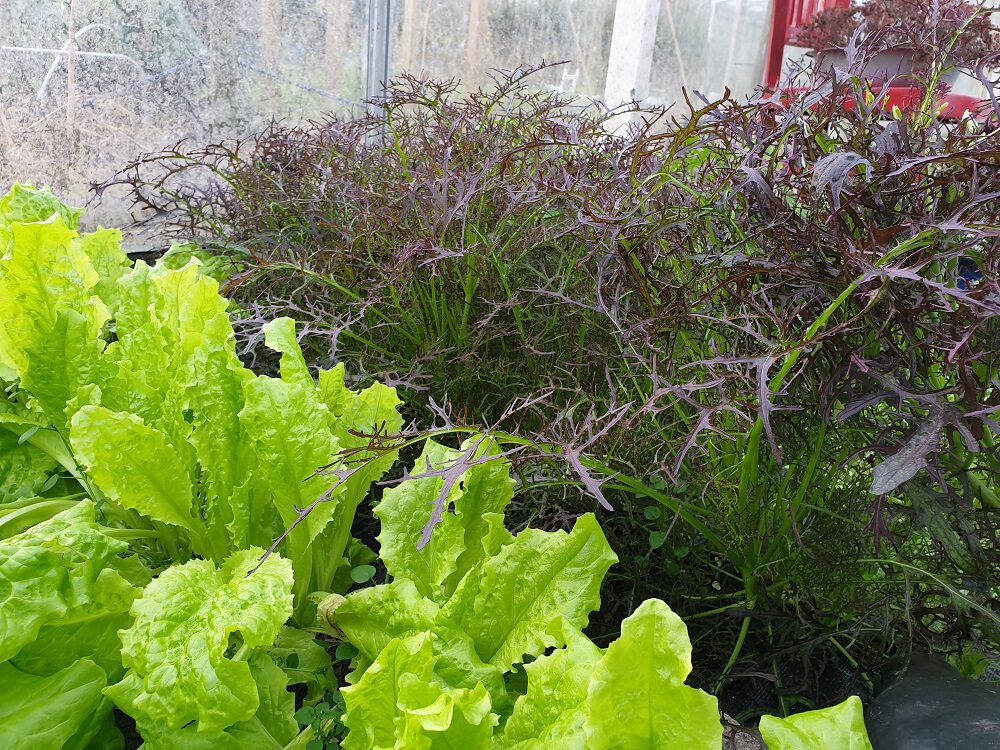 We proberen de warmte in de grond ook nog wat extra te vangen en te behouden door bodembedekking aan te brengen, in de vorm van bijvoorbeeld repen zwart gronddoek tussen de rijtjes groenten. In een andere kas hebben we juist kriskras door elkaar gezaaid en geplant en ook daar staan de planten er nog goed bij. De foto hierboven is bijvoorbeeld in kas 2 gemaakt (alle foto’s op deze pagina maakte ik dit jaar op 21 december). Je ziet er soorten als tuinkers, bietjes, spitskool, snijbiet, komatsuna (met het paarse blad) en tatsoi (met het donkergroene lepelvormige blad). In deze kas staan buiten de foto ook nog boerenkool, mosterdblad, rucola, bloemkool, tuinbonen, selderij, peterselie en spitskool.