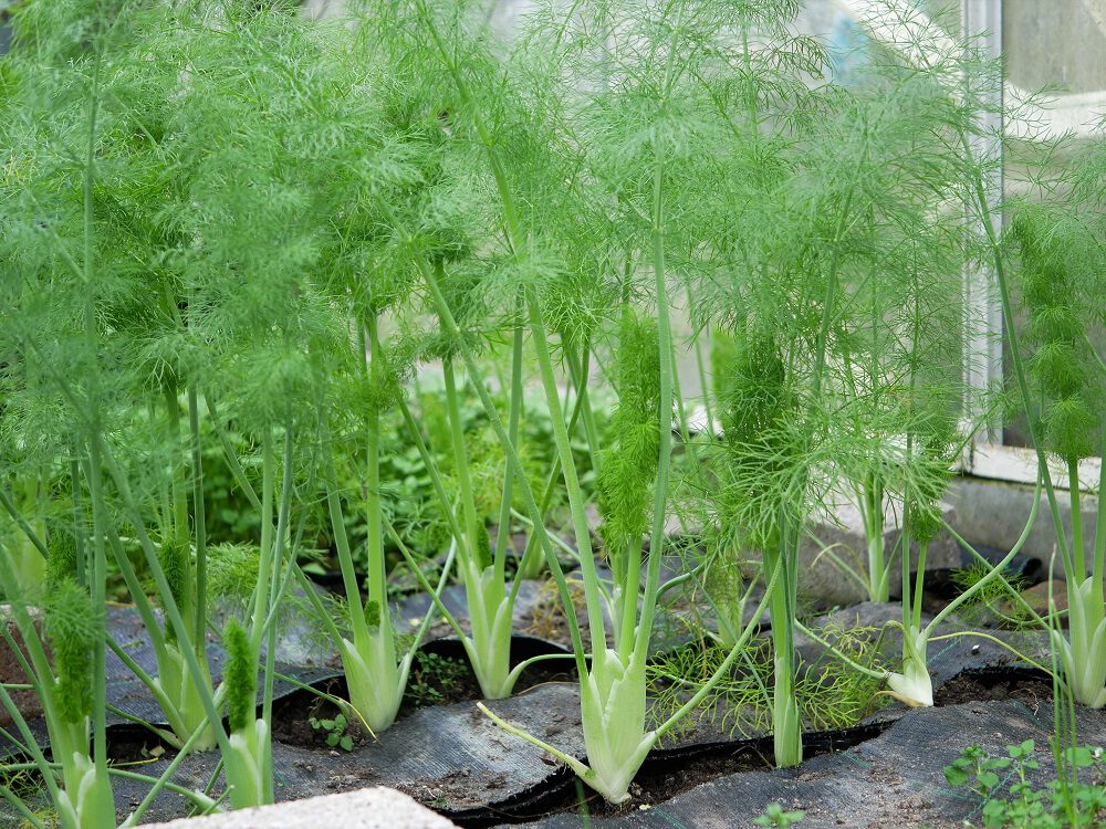 En dan is er nog de laatste kas, daarin hebben we soorten gezaaid die beter in rijtjes gezaaid kunnen worden, met daartussen dus die repen gronddoek. Dit is niet zo mooi, maar wel nuttig. In deze kas staan onder andere rijtjes met veldsla, pluksla, snijsla, rijtjes radijs, mosterdblad, bietjes, worteltjes, winterpostelein, tuinkers, knolvenkel, lente-ui, kervel, rucola, winteruien en knoflook.