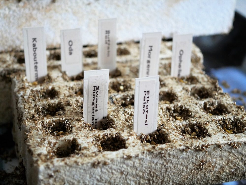 Ik duw met mijn wijsvinger altijd een soort kommetje/holletje in het vermiculiet: daarin laat ik per soort 2 zaden vallen (in de hoop dat er 1 kiemt, maar mochten ze beide kiemen, dan is het door de luchtigheid van vermiculiet ook nog makkelijk om ze later van elkaar te scheiden en allebei op te potten). Nadat ik de zaden heb gezaaid strooi ik nog wat droog vermiculiet over de zaden en maak dat heel kort en oppervlakkig met een plantenspuit met lauw water nat.