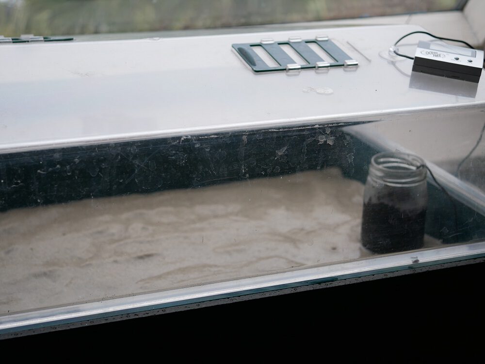 En zo begin ik: de propagator of bak wordt gevuld met een laagje nat zand (dat voorkomt uitdrogen, zorgt voor een hoge luchtvochtigheid en geleidt goed). Ik plaats een potje met grond plus voeler en thermometer en laat het geheel al een paar uur voor het zaaien op temperatuur komen.