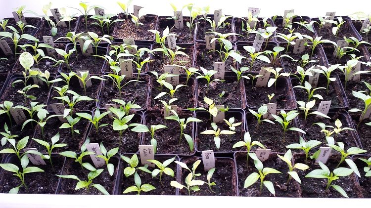En tot slot dan nog een foto van de pepers; pepers en paprika’s zijn soorten die langzaam kiemen en langzaam groeien, en omdat het subtropische planten zijn hebben ze een lange tijd nodig om vruchten te kunnen maken. Dit zijn dus wel soorten die je vroeg en warmt moet zaaien, maar dan wel zo licht mogelijk want anders worden ook zij lang en dun.