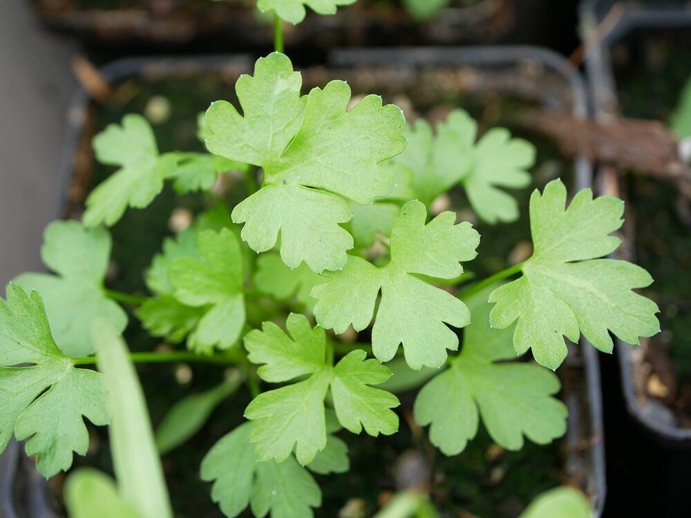 Zo ziet bijvoorbeeld een pas verspeende peterselie-zaailing eruit, heel klein en iel: