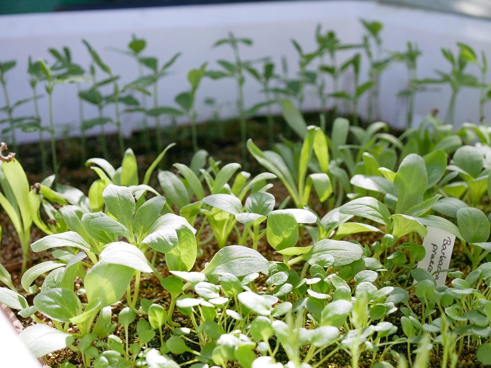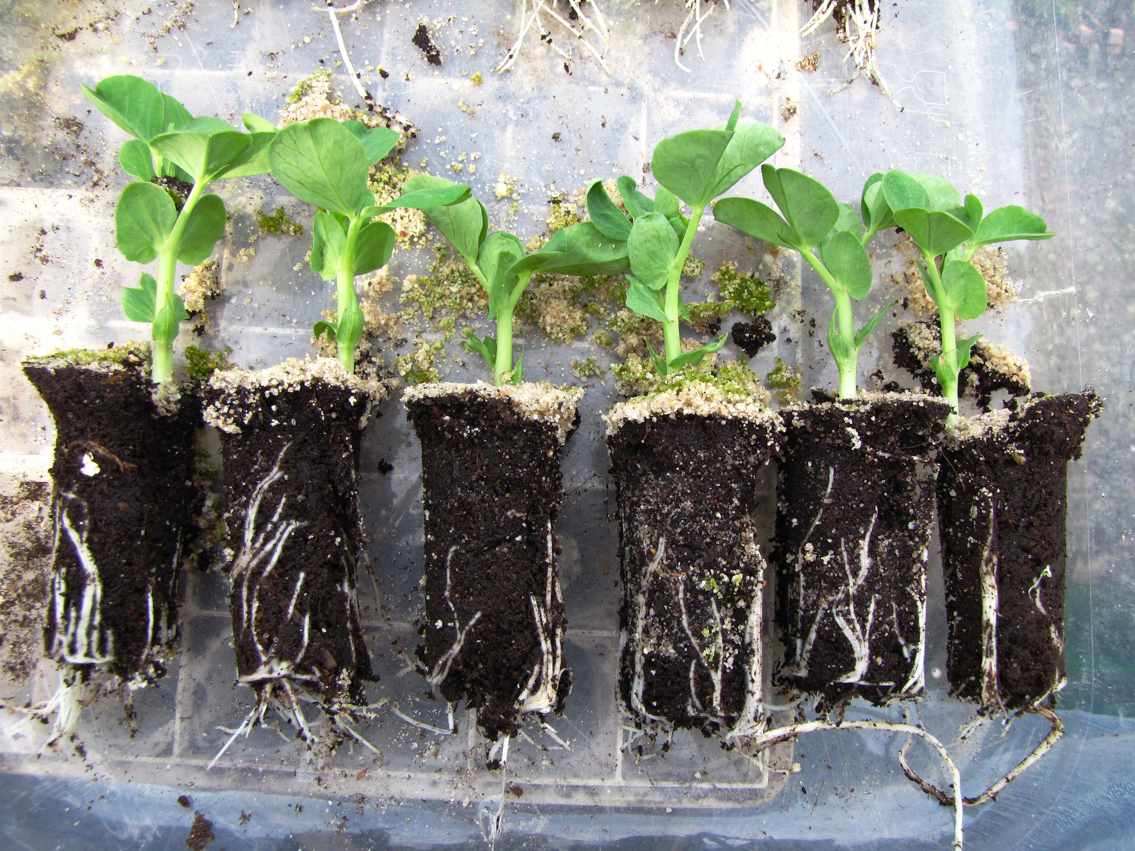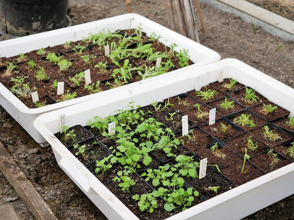 Sommige soorten kunnen vanuit een trays gelijk buiten worden uitgeplant, zoals snijbiet, bietjes, doperwten, Lathyrus, rucola, etc. Maar soms plant ik de plugjes eerst nog uit in 9-centimeterpotje met potgrond. Dat kan verschillende redenen hebben: