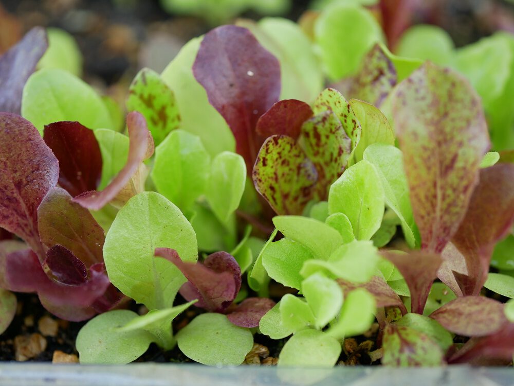 Deze sla-zaailingen zijn groot genoeg en kunnen gelijk buiten worden uitgeplant. Ik maak daarvoor de grond in het bakje zo nat als modder, dan kan ik de zaaiingen wat makkelijker van elkaar scheiden (ik trek ze los van elkaar) zonder al te veel worteltjes te beschadigen.