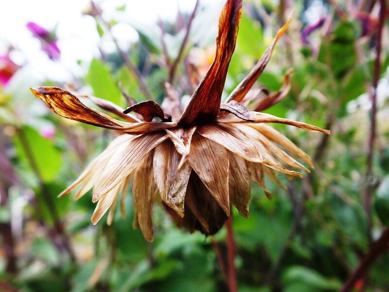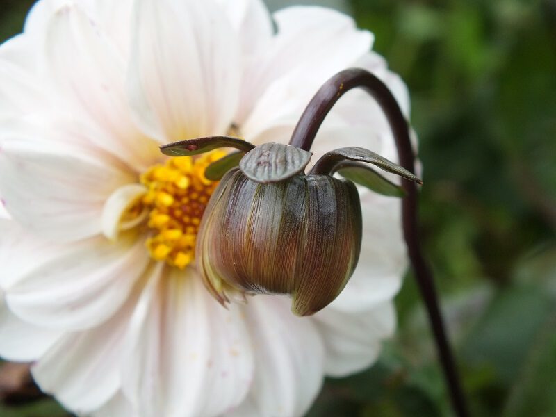 Je ziet dat een knop (die dus nog moet gaan bloeien) een ronde vorm heeft, en dat een uitgebloeide Dahliabloem een meer puntige vorm heeft. Als je de uitgebloeide Dahliabloem laat rijpen gaan uiteindelijk de uitgebloeide bloemblaadjes uit elkaar staan, zoals op de foto hieronder.