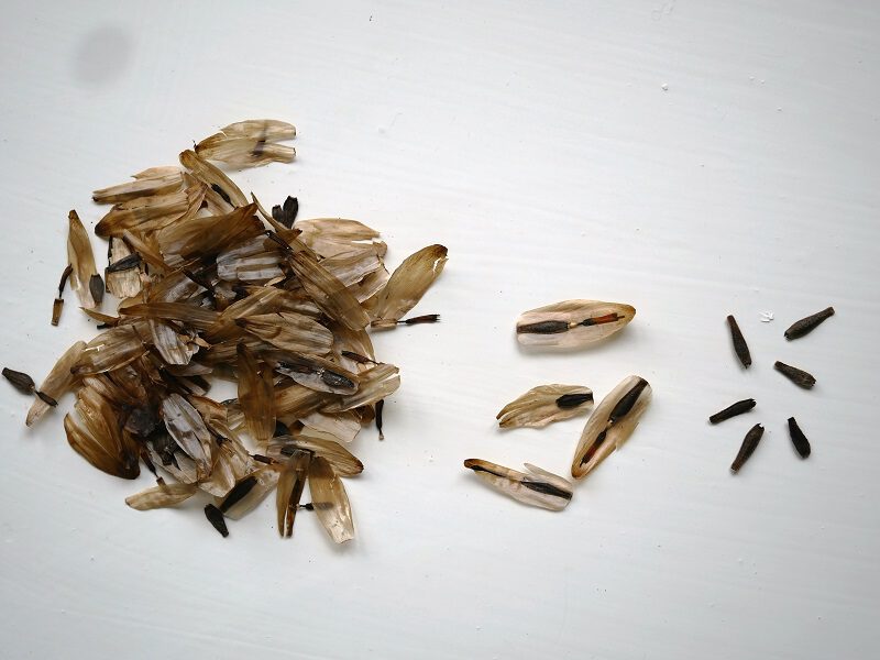 Je ziet links het hoopje geplukte uitgebloeide bloemblaadjes. Rechts ervan zie je de zaden op de papierachtige blaadjes, en helemaal rechts zie je de uiteindelijke zaden; ze zien eruit als kleine zwarte schoenlepeltjes. Laat de zaden nog een weekje bij kamertemperatuur drogen en bewaar ze dan donker, droog en koel tot het volgende voorjaar. Als je de zaden rond maart bij kamertemperatuur zaait zullen de zaden binnen ongeveer 2 weken kiemen en kun je volgende zomer vanaf ongeveer half juli van je bloeiende zelfgezaaide Dahlia’s genieten!!