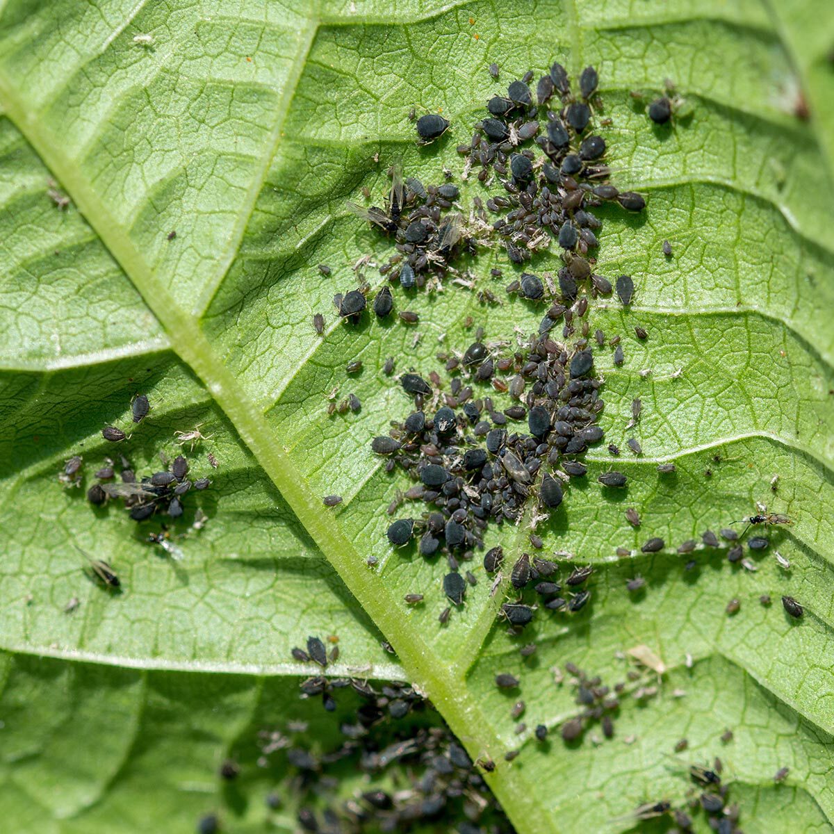 De zwarte bladluis is tot 7 mm groot en komt vaak voor op de toppen van jonge stengels met groeiend blad en bloemknoppen. Deze bladluis kan vleugels hebben en voedt zich graag met het plantensap van jouw planten. Reken erop dat de plaag zich snel uit kan breiden tot een hardnekkige plaag, aangezien dit soort luis zich snel vermeerdert. Wees er dus vroeg bij met behandelen.