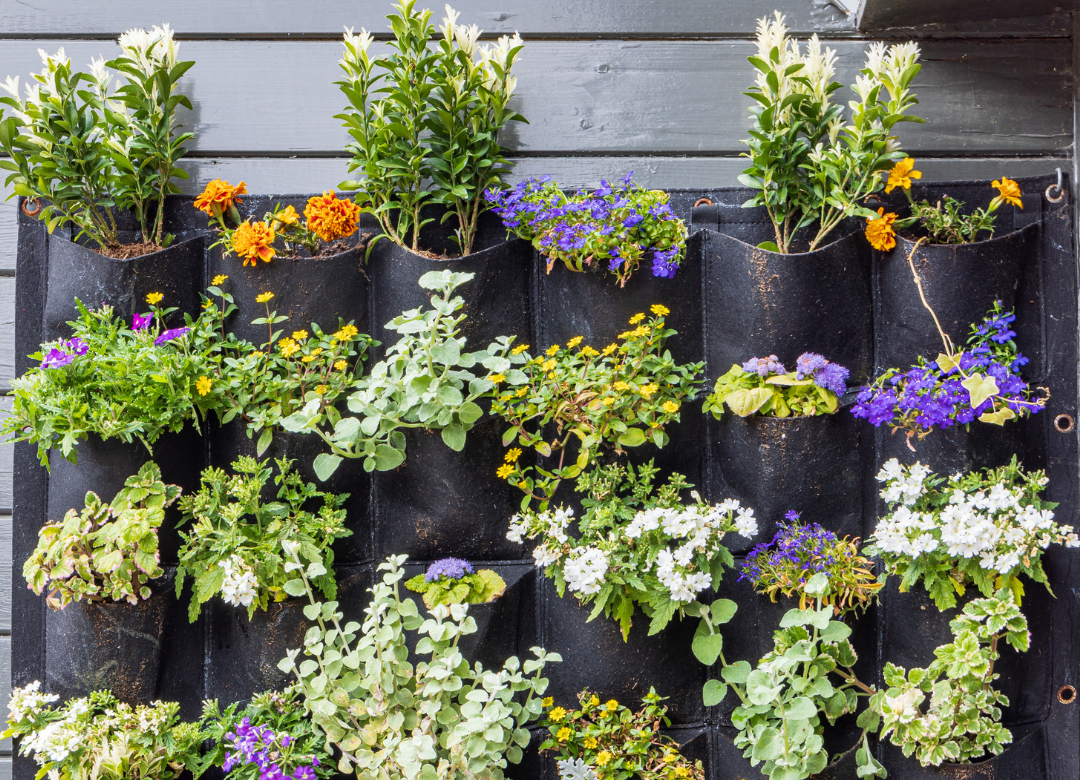 Kijk niet alleen naar de grond, maar ook naar je muren en schuttingen. Klimplanten doen het vaak goed in potten en je kan eenvoudig een rek of draad bevestigen als ondersteuning. Verticale tuinen zijn erg populair geworden. Er is een enorm aanbod aan hangmanden, plantenbakken voor de muur, bloemtorens... Je kan zelfs zelf creatieve plantenbakken maken om aan je muur te hangen! Bedek je schutting met een mooie klimop en kies boven je terras voor een dakboom.