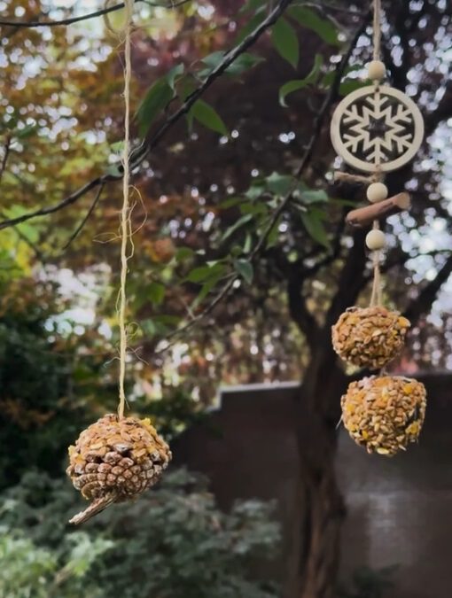 - Ophangen: Hang de dennenappel aan het touwtje op in bijvoorbeeld een boom of aan een haakje in je tuin.