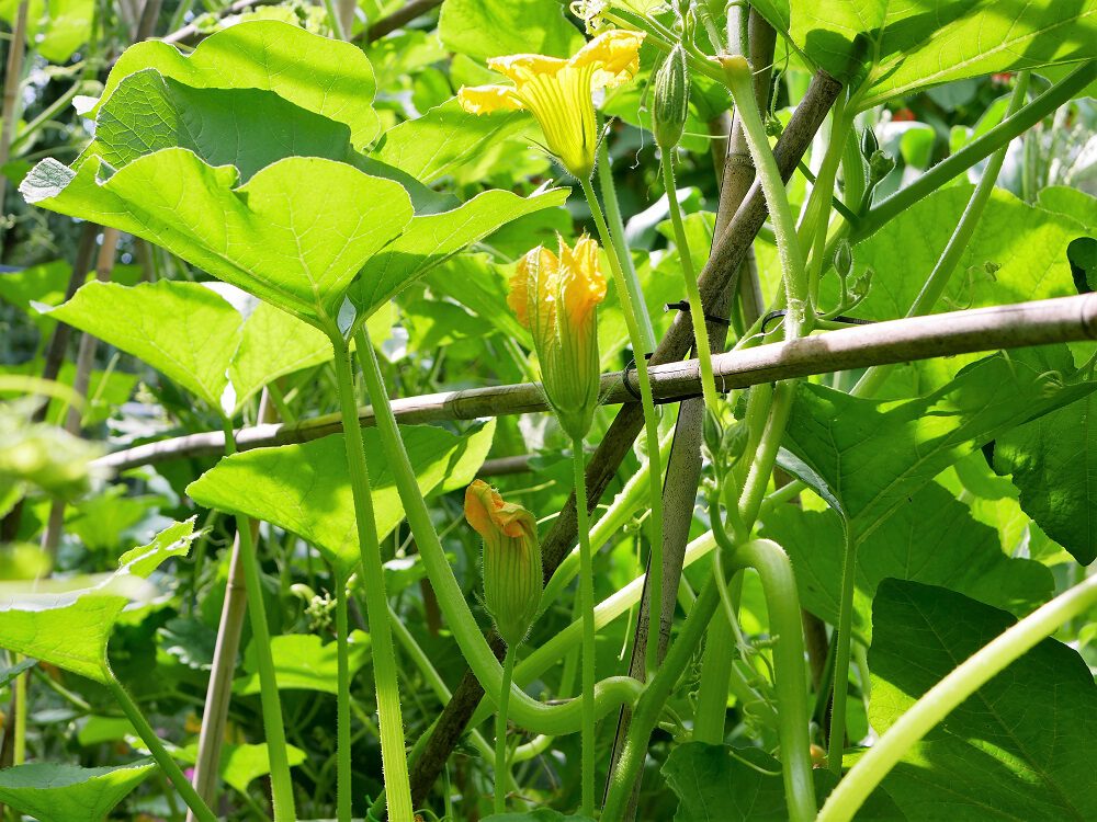 Op deze foto zie je een pompoenplant aan een klimsteun begin juli. De plant is al best groot en toch tel ik maar liefst 7 mannelijke bloemen en geen enkele vrouwelijke bloem.