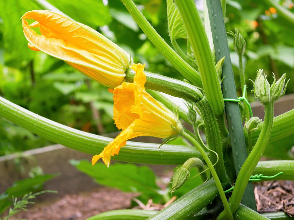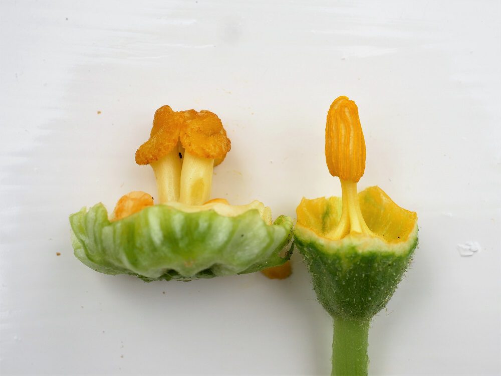 Als je aan deze voorwaarden hebt voldaan kan het toch gebeuren dat er courgettes en pompoenen na de bloei geel worden en verschrompelen. Om te bedenken waarom dat gebeurt is het handig om te begrijpen hoe de bloemen van deze planten worden bestoven. Courgettes en pompoenen maken vrouwelijke bloemen met daaronder een vruchtbeginsel. En ze maken mannelijke bloemen op een steeltje die voor de bevruchting moeten zorgen. Beide bloemen bloeien aan dezelfde plant.