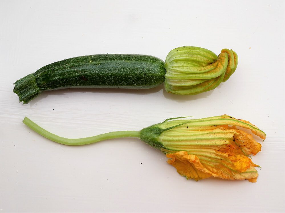 Op deze foto zie je een vrouwelijke bloem met vruchtbeginsel (een mini-courgette) en een mannelijke bloem op een steeltje.