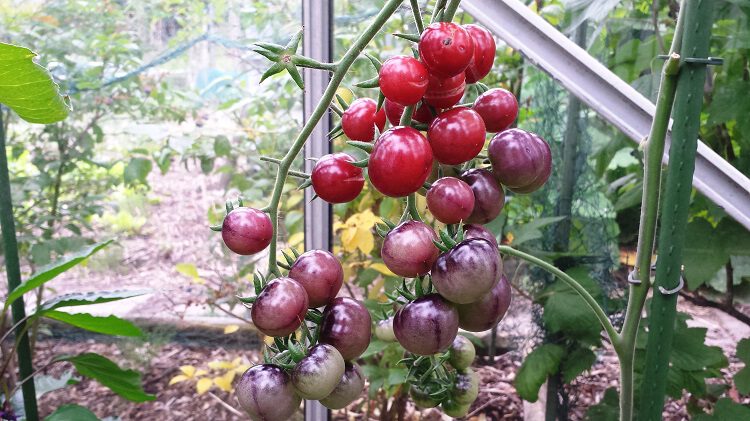 Ook van ‘blauwe’ oorsprong. Maar gekruist met een meer geschikte partner (geen idee met welk ras ze is gekruist, het geheim van de kweker). Maar dit zijn ook gezonde planten. En wel 3 keer zoveel meer tomaatjes per tros. Mooier en feller ook van kleur (meer blauw in het onrijpe, meer rozepaars in het rijpe). En lekkerder, eerlijk is eerlijk, gewoon meer tomatensmaak met een zoetje en een zuurtje. Als ik volgend jaar moet kiezen, dan kies ik deze. Zo vreemd is het dus eigenlijk niet om te vergelijken, keuzes en plannen te maken.