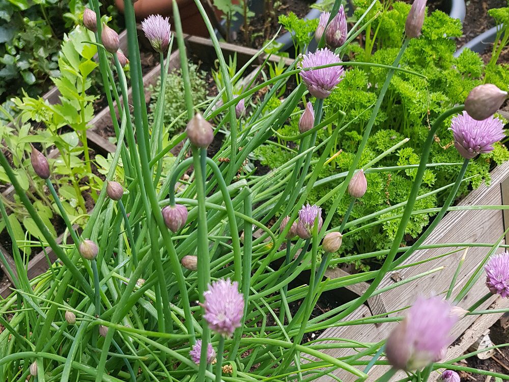 Ook de bieslook van 2 jaar terug staat in bloei en wat zijn ze bloemen mooi zeg. Wist je dat je deze bloemen kon eten? Ieder bloemetje smaakt naar een uitje. Ze zijn dus superlekker om door een salade te mengen. Ook kun je ze laten trekken in olie of je laat ze 3 maanden trekken in azijn. Zo krijg je naar uien/knoflook smakende olie en azijn voor salades.