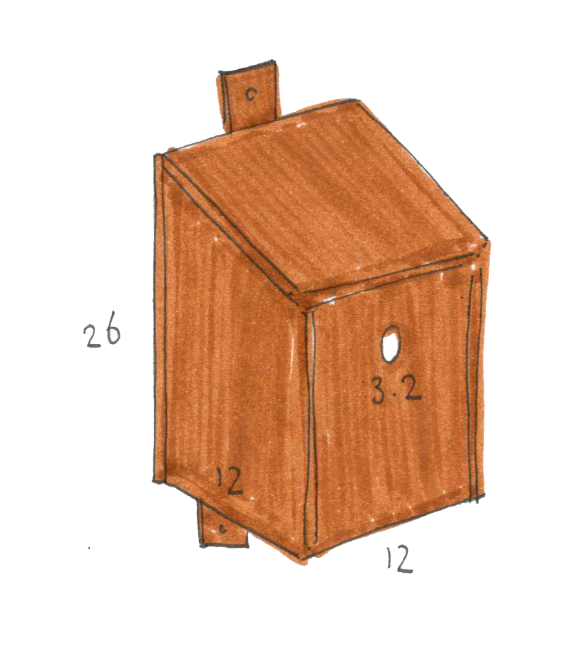 - Nadat het huisje in elkaar zit, kun je een gat maken in de voorkant met een cilinderboor met de juiste afmeting. Deze zijn te koop bij iedere doe-het-zelfzaak. Kies een boor met een diameter van 3 cm voor een koolmeesje. Een stokje kun je toevoegen voor de sier, maar dit heeft verder geen functie. Kleine vogeltjes hebben dit niet nodig.