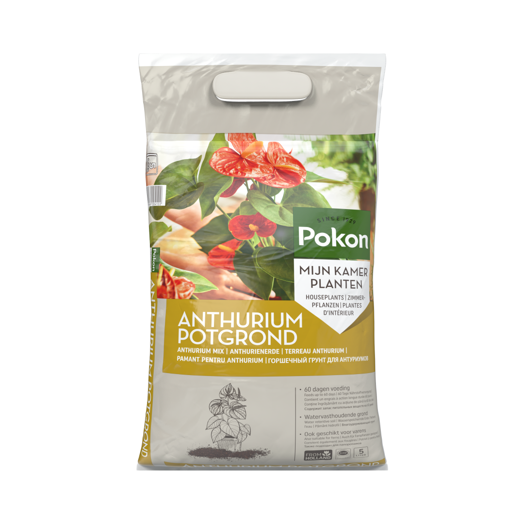 Je kunt de Anthurium bij voorkeur eens in de twee jaar in de lente verpotten als je merkt dat de plant te groot wordt. Door je Anthurium in een nieuwe pot te zetten, geef je de wortels weer alle ruimte om te groeien. Zorg goed voor je Flamingoplant, door te kiezen voor de beste potgrond. Gebruik voor je Anthurium de Pokon Anthurium Grond. Deze speciale potgrond heeft een luchtige basis en houdt water goed vast.