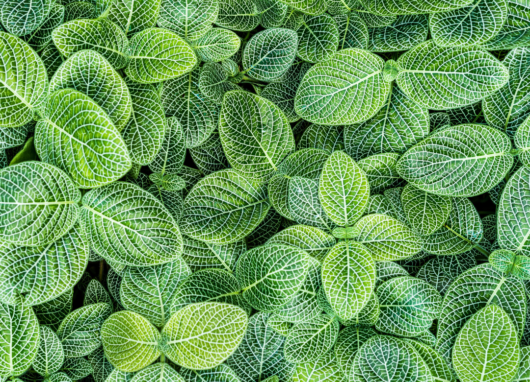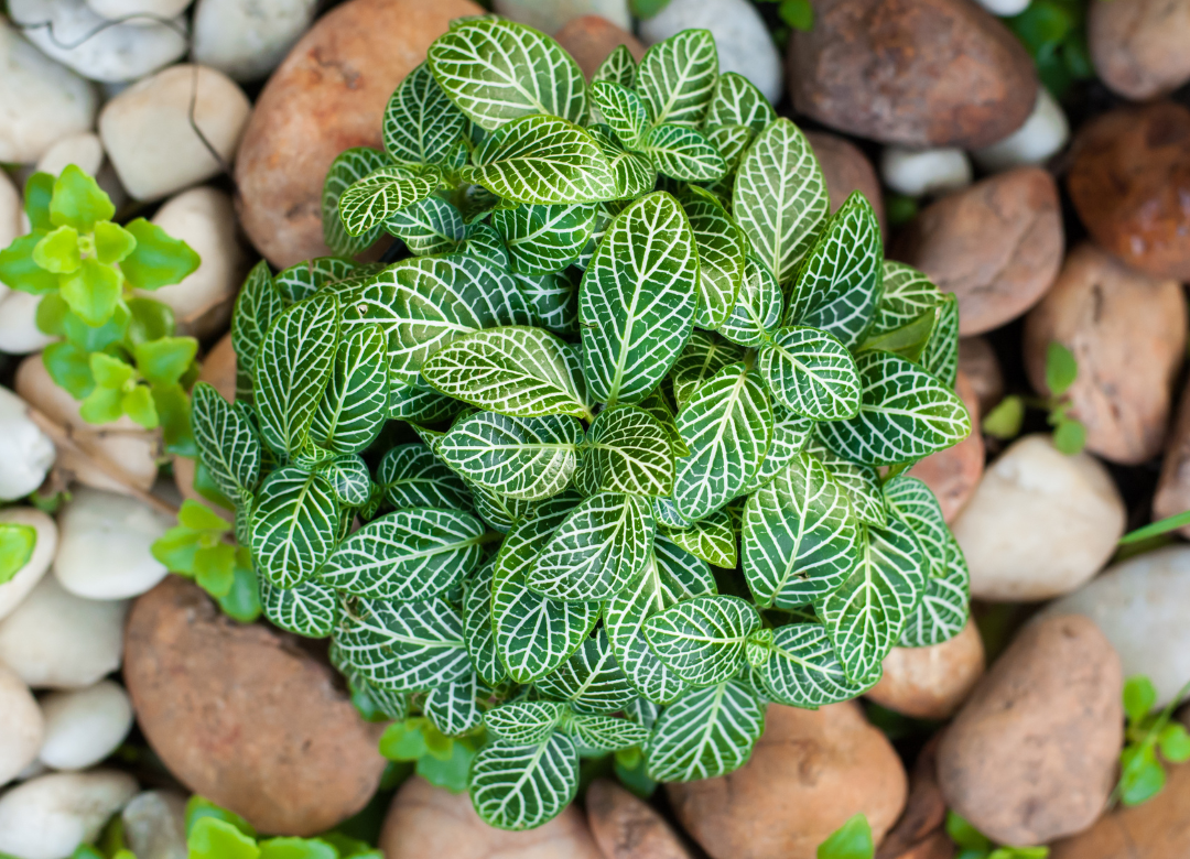 De Fittonia heeft groene, ovaal vormige blaadjes met opvallend gekleurde lijnen die een uniek mozaïek patroon vormen.
