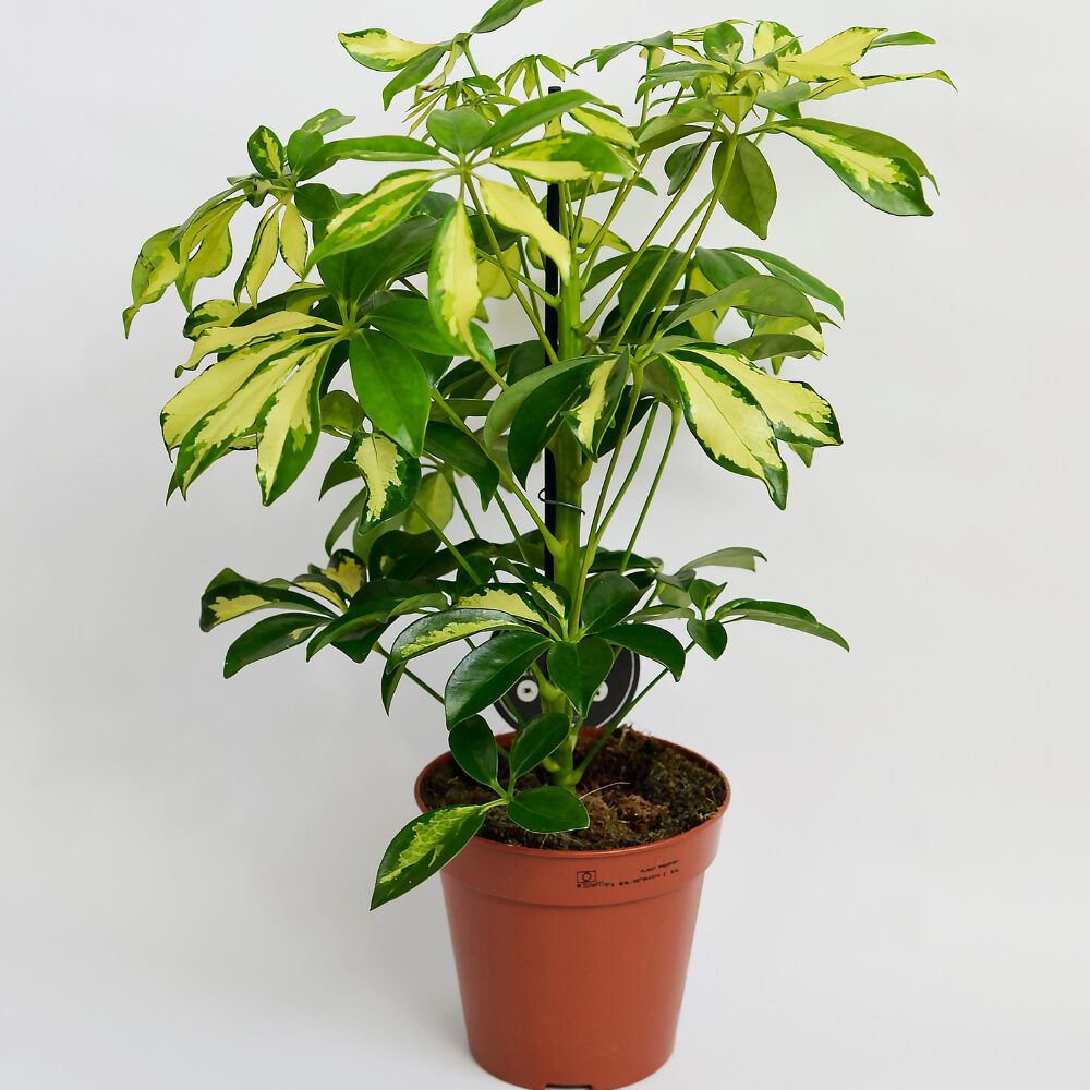 De Schefflera Gold Capella onderscheidt zich door zijn bonte bladeren met een mix van groen en geel.