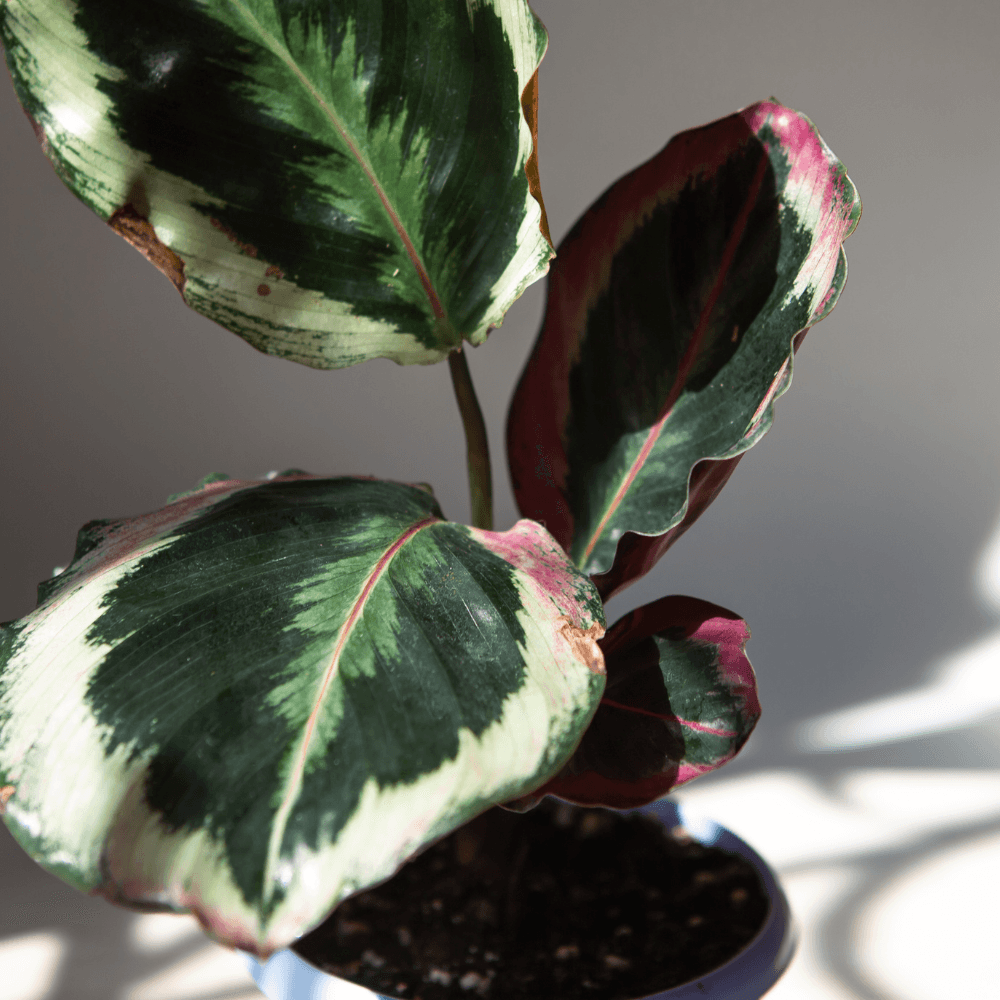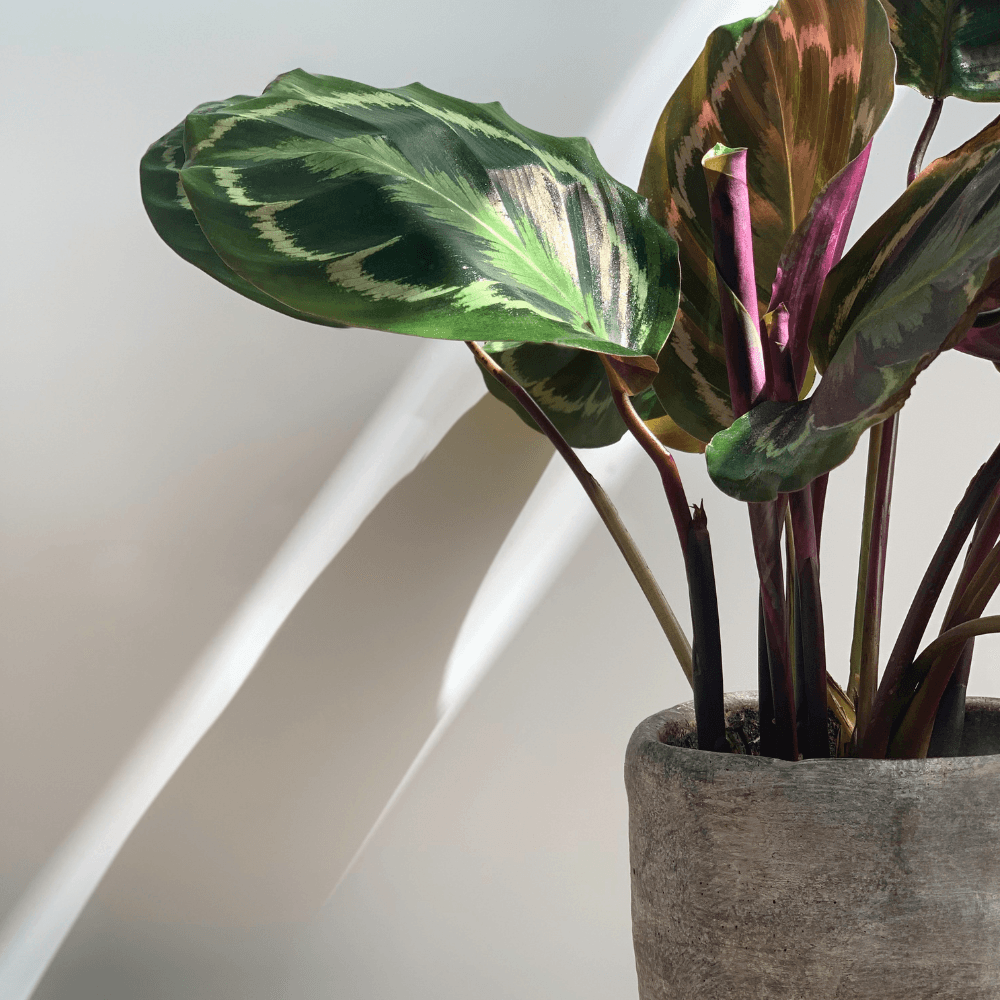 Gele bladeren bij de Calathea Medaillon ontstaan vaak door een te lage luchtvochtigheid, onregelmatig water geven (te veel of te weinig), of het gebruik van kalkrijk water. Ook te veel direct zonlicht kan de bladeren geel doen verkleuren. Omdat de Calathea Medaillon van een vochtige omgeving houdt, is het belangrijk om de luchtvochtigheid hoog te houden door regelmatig te sproeien of de plant in een vochtige ruimte te plaatsen, zoals de badkamer. Gebruik bij voorkeur water op kamertemperatuur en liefst gefilterd of regenwater om kalkophoping te voorkomen. Zo voorkom je gele bladeren en blijft de plant gezond en stralend.