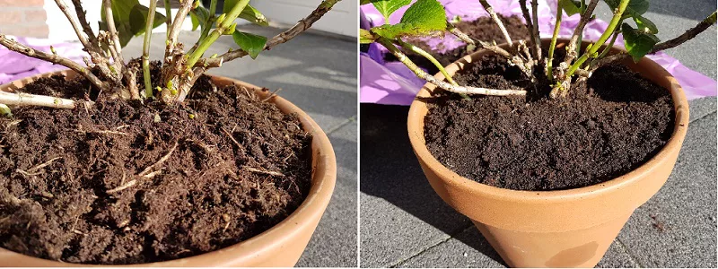 Links: potgrond met alternatieve grondstoffen. Rechts: potgrond zonder alternatieve grondstoffen.