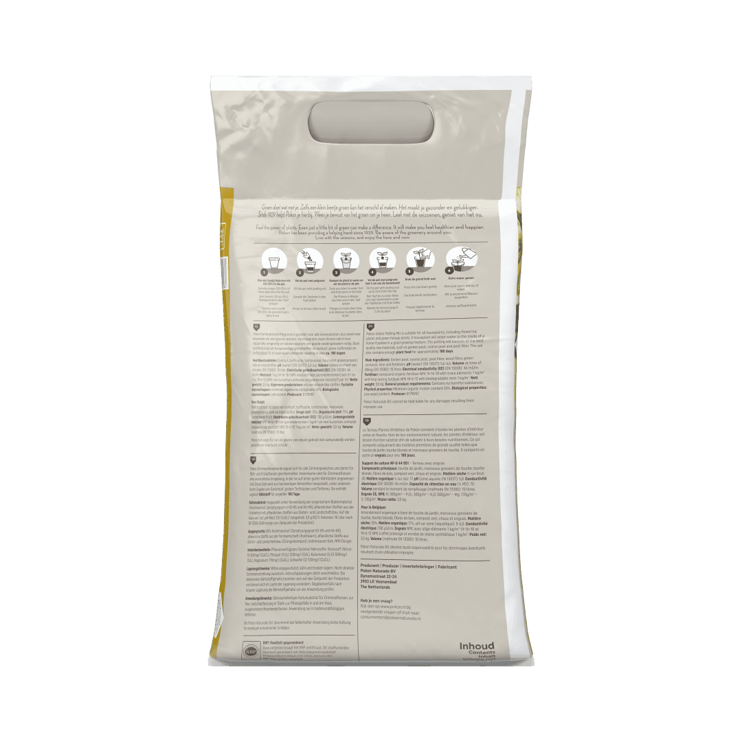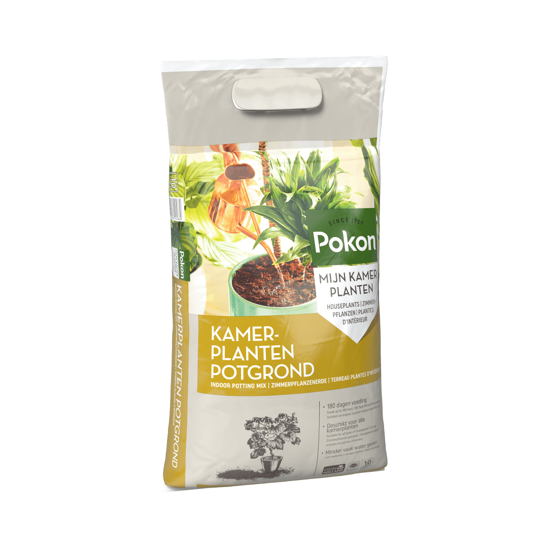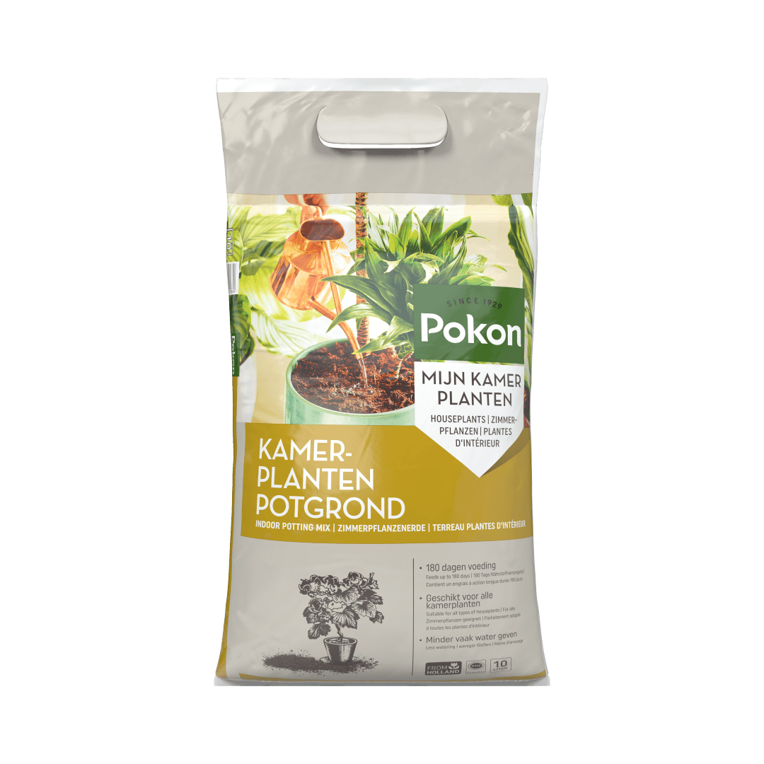 Pokon Kamerplanten Potgrond is geschikt voor alle kamerplanten, dus zowel voor bloeiende als voor groene planten. Kamerplanten staan binnen niet in hun natuurlijke omgeving en hebben daarom een goede voedingsbodem nodig. Deze grond bestaat uit hoogwaardige grondstoffen als tuinturf, grove turfbrokjes, turfstrooisel. Er zit daarnaast voldoende voeding in voor ca. 180 dagen. Ben je opzoek naar potgrond voor anthurium, bonsai, cactus, orchidee of palm? Dan kun je ook kiezen voor speciale Pokon potgrond.