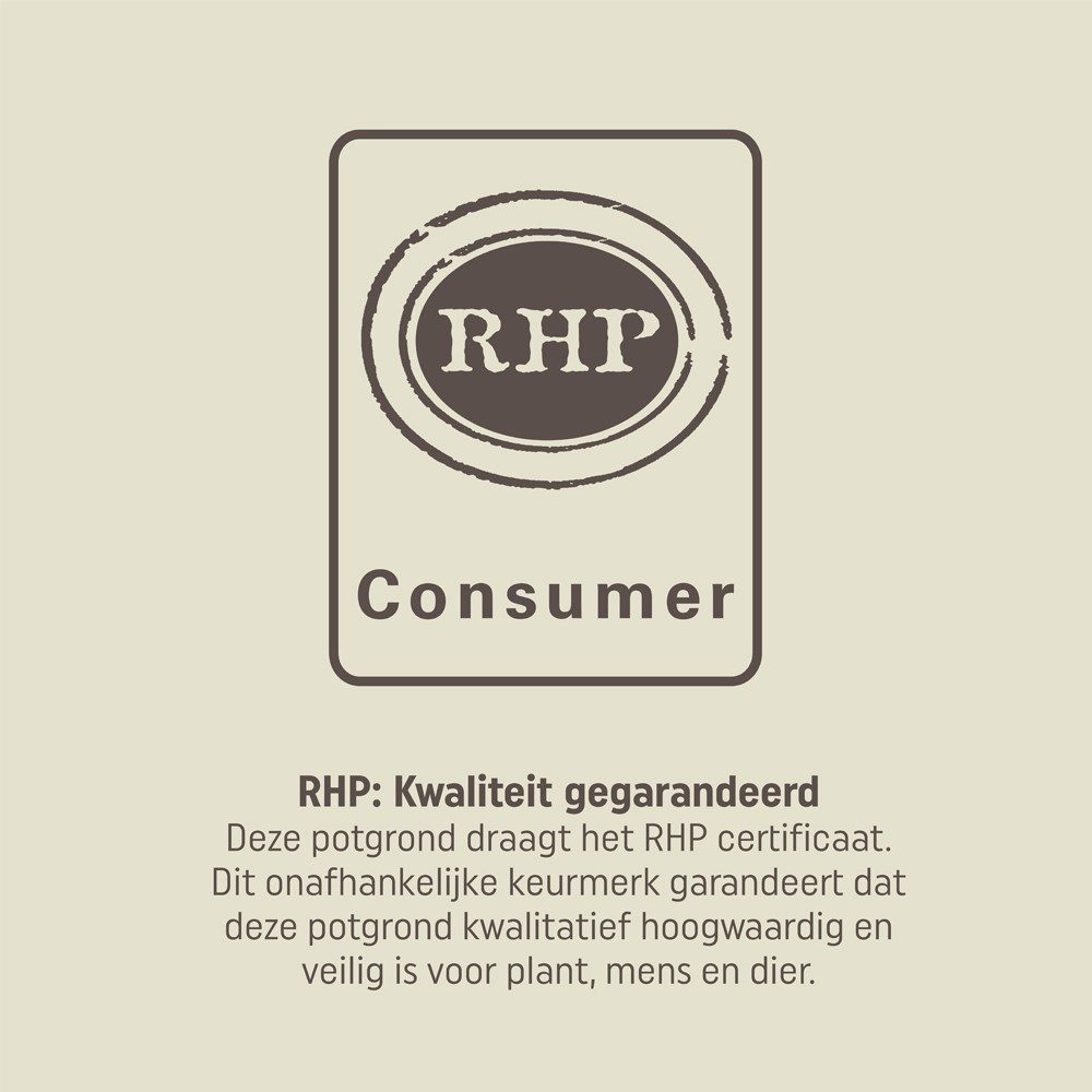 Deze potgrond voldoet aan de eisen van het onafhankelijke RHP Keurmerk. Daarom kunnen wij garanderen dat dit een veilig en betrouwbaar product is.