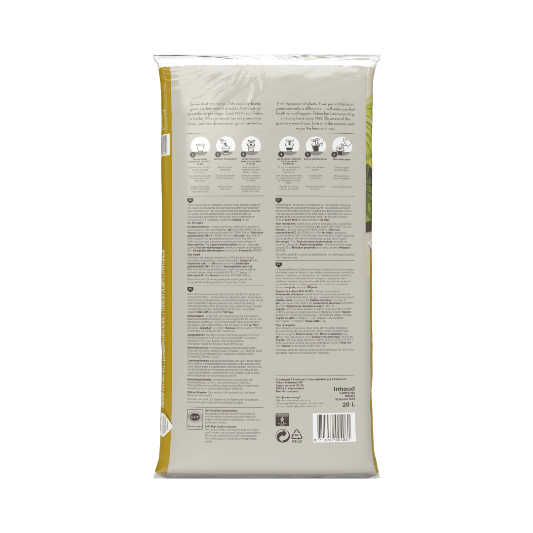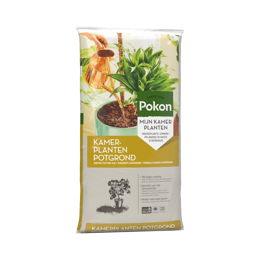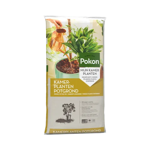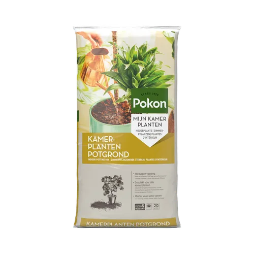 Pokon Kamerplanten Potgrond is geschikt voor alle kamerplanten, dus zowel voor bloeiende als voor groene planten. Kamerplanten staan binnen niet in hun natuurlijke omgeving en hebben daarom een goede voedingsbodem nodig. Deze grond bestaat uit hoogwaardige grondstoffen als tuinturf, grove turfbrokjes, turfstrooisel. Er zit daarnaast voldoende voeding in voor ca. 180 dagen. Ben je opzoek naar potgrond voor anthurium, bonsai, cactus, orchidee of palm? Dan kun je ook kiezen voor speciale Pokon potgrond.