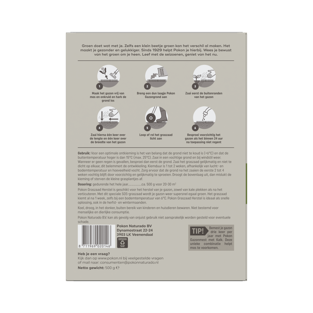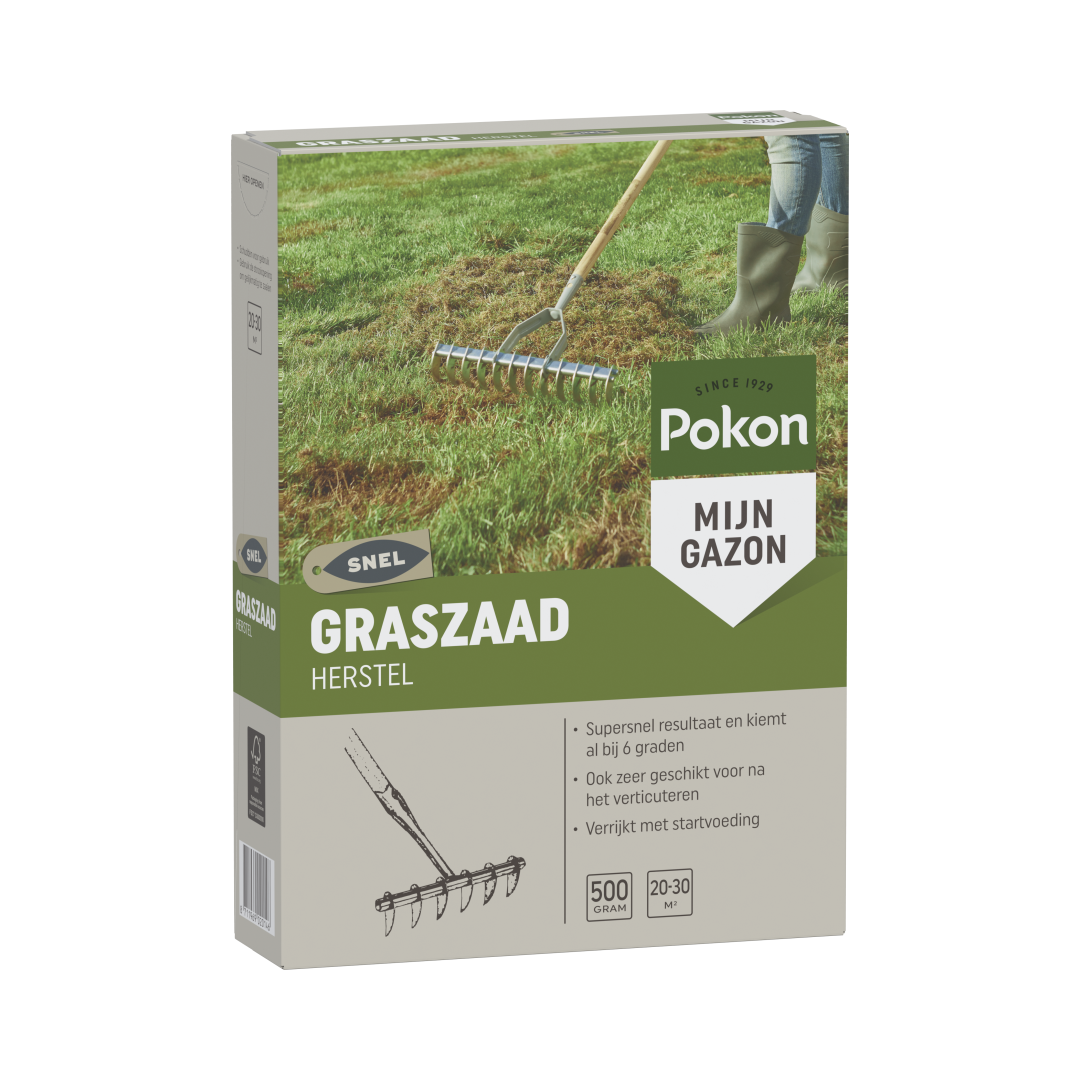 Kale plekken in je gazon kunnen ontstaan na de winter of na het verticuteren. Met Pokon Graszaad Herstel is je gazon supersnel weer egaal groen. Het graszaad kiemt al binnen 1 week, zelfs bij een bodemtemperatuur van 6°C. Je kunt Pokon Graszaad Herstel ook gebruiken voor het doorzaaien van het gazon.