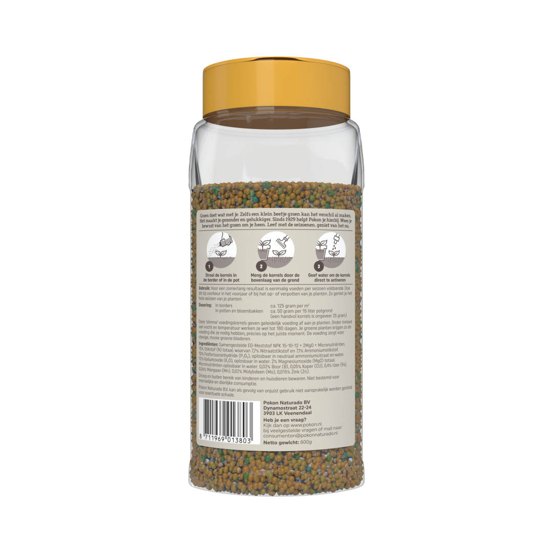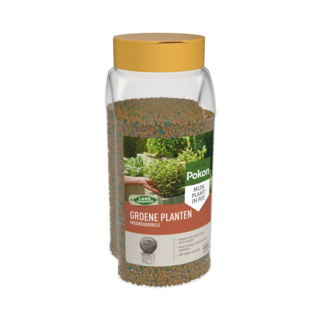 Pokon Groene Planten Voedingskorrels hebben een samengestelde meststof NPK 15-10-12 + 2MgO + Micronutriënten.