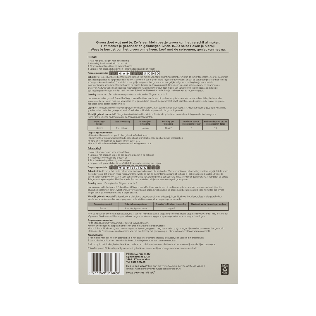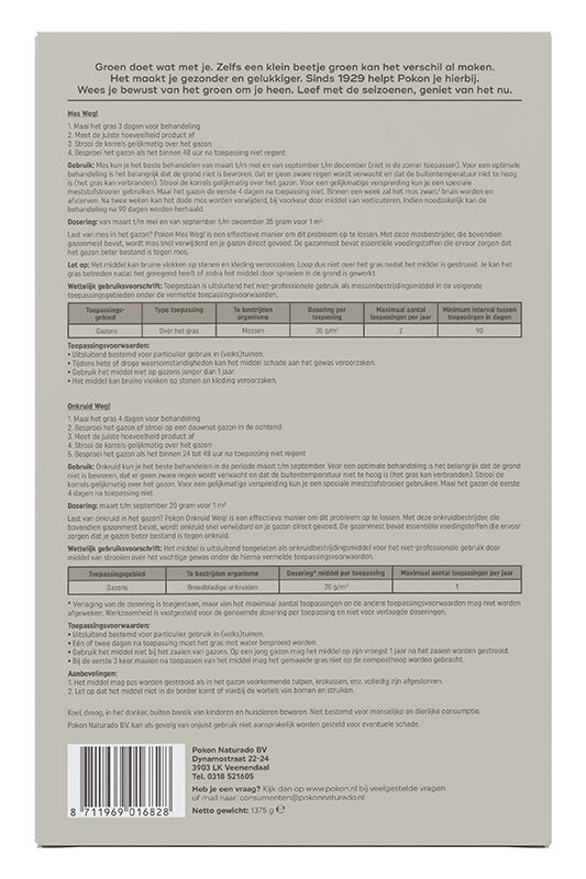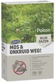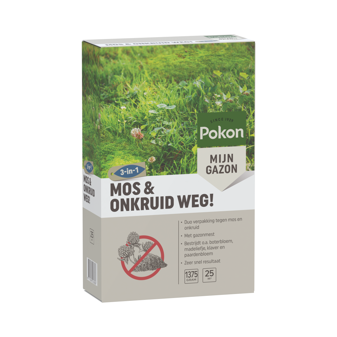 Pokon Mos en Onkruid Weg! is een pakket met zowel een gazonvoeding met onkruidbestrijder als een gazonvoeding met mosbestrijder. Door mos en onkruid verstikt het gras waardoor het gazon wordt verstoord. Pokon Mos Weg! geeft voeding aan het gazon en werkt snel en effectief tegen mossen in gazons. Onkruid Weg! geeft voeding aan het gazon en is werkzaam tegen boterbloem, madeliefje, witte klaver en paardenbloem.