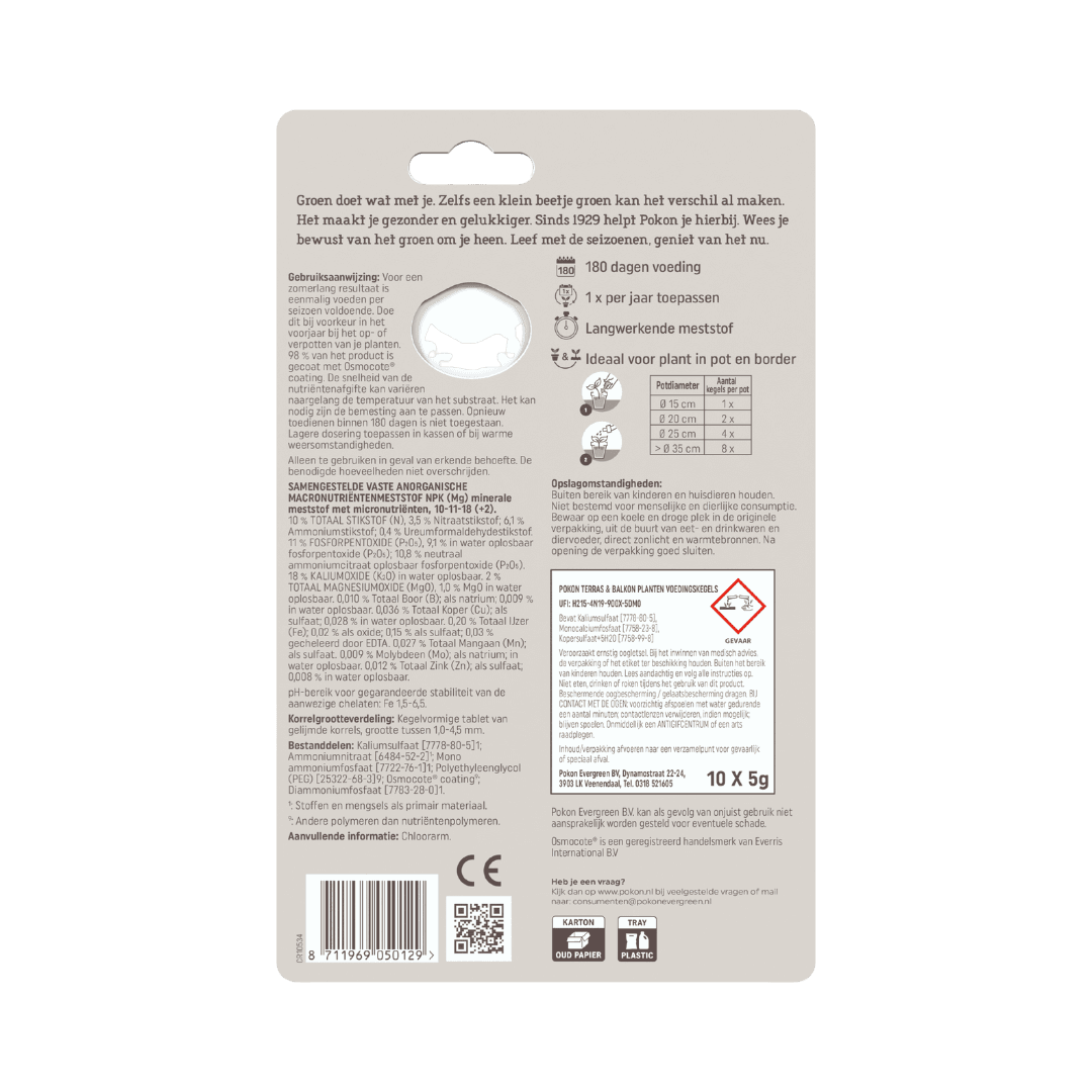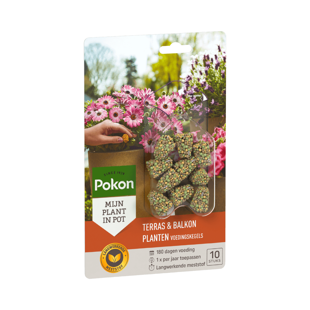 Wil je jouw terras- of balkonplanten makkelijk en langdurig voeden? Met Pokon Voedingskegels zit je helemaal goed! Deze handige kegels geven tot wel 180 dagen voeding af: dat is een heel seizoen genieten van gezonde en bloeiende planten, zonder gedoe!