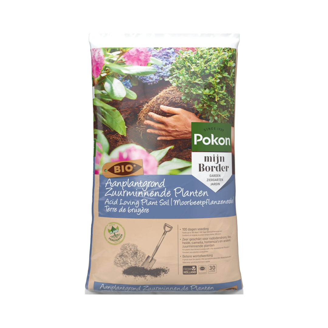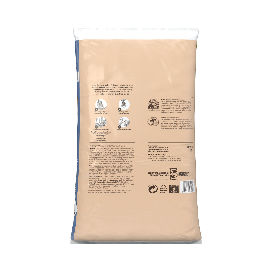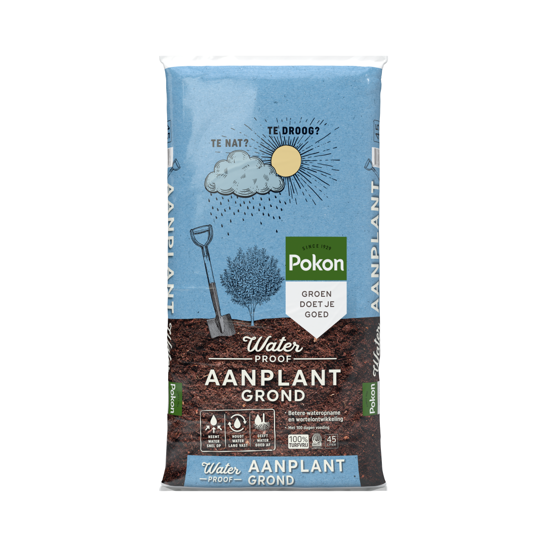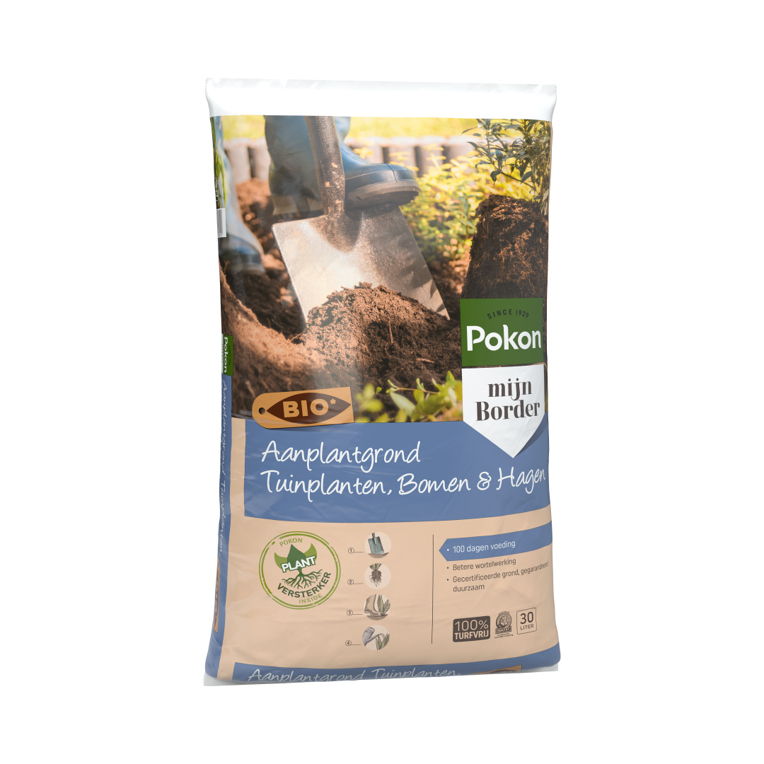 De Pokon Bio Aanplantgrond Tuinplanten, Bomen & Hagen Turfvrij is multifunctioneel. Deze aanplantgrond kan gebruikt worden voor alle tuinplanten, bomen en hagen in de border. Deze aanplantgrond is biologisch en turfvrij. In deze aanplantgrond zit gecomposteerd beukenblad. Dit zorgt voor extra bodemleven waardoor de plant beter aanslaat. Door de toevoeging van klei wordt vocht beter vastgehouden. Bovendien zijn er meststoffen toegevoegd voor ca. 100 dagen.
