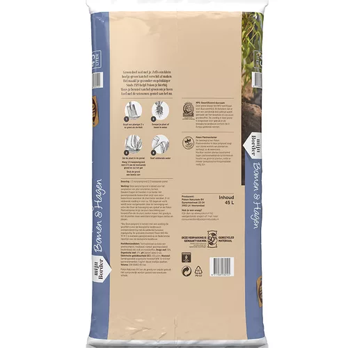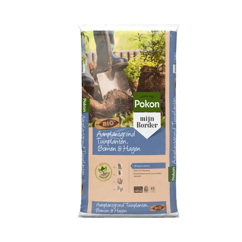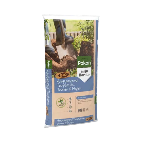 De Pokon Bio Aanplantgrond Tuinplanten, Bomen & Hagen Turfvrij is multifunctioneel. Deze aanplantgrond kan gebruikt worden voor alle tuinplanten, bomen en hagen in de border. Deze aanplantgrond is biologisch en turfvrij. In deze aanplantgrond zit gecomposteerd beukenblad. Dit zorgt voor extra bodemleven waardoor de plant beter aanslaat. Door de toevoeging van klei wordt vocht beter vastgehouden. Bovendien zijn er meststoffen toegevoegd voor ca. 100 dagen.