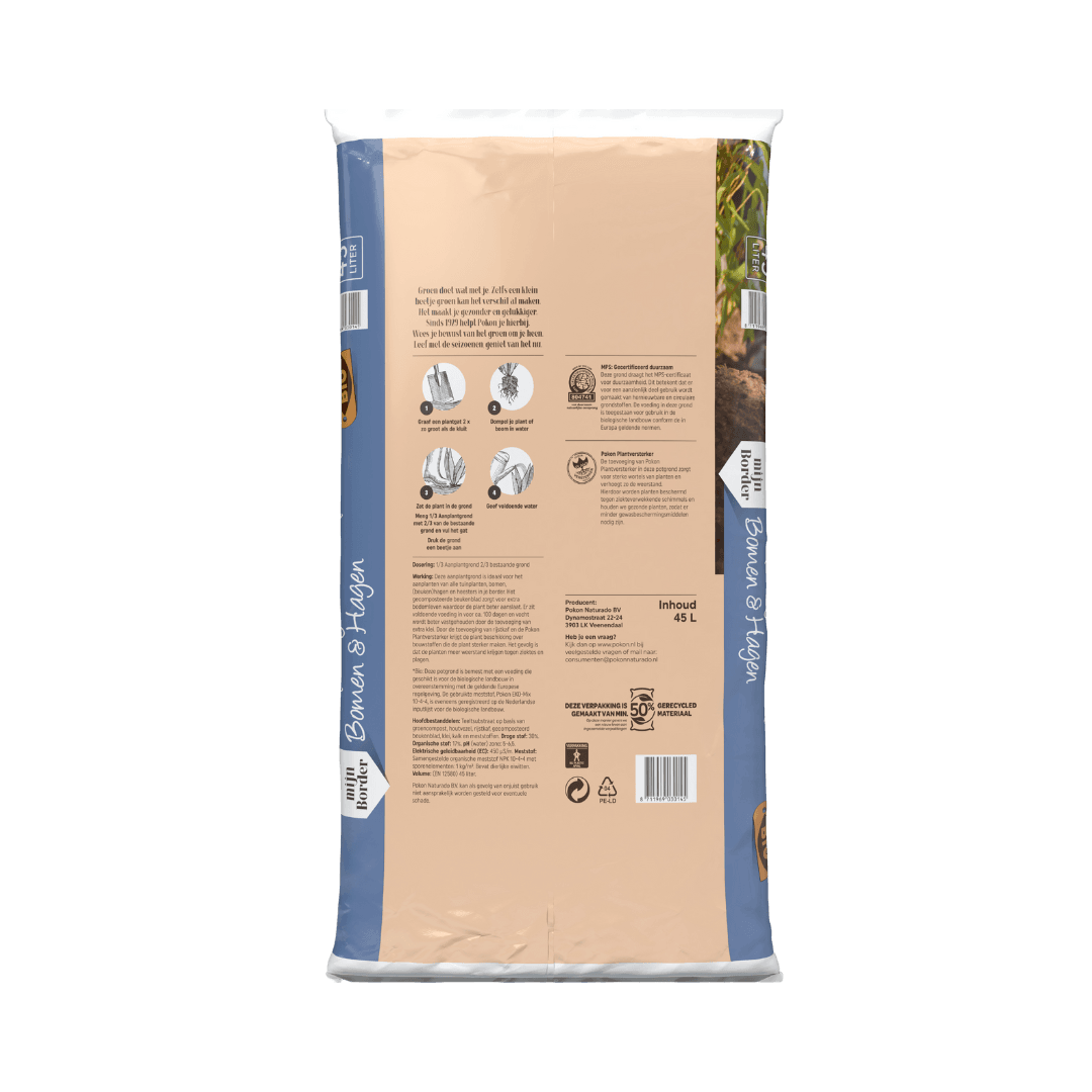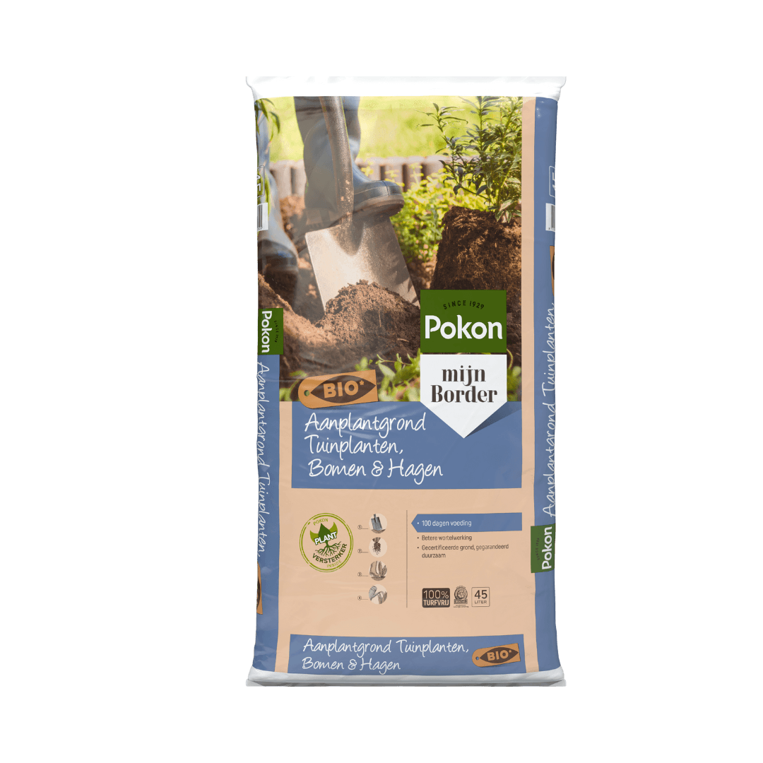 De Pokon Bio Aanplantgrond Tuinplanten, Bomen & Hagen Turfvrij is multifunctioneel. Deze aanplantgrond kan gebruikt worden voor alle tuinplanten, bomen en hagen in de border. Deze aanplantgrond is biologisch en turfvrij. In deze aanplantgrond zit gecomposteerd beukenblad. Dit zorgt voor extra bodemleven waardoor de plant beter aanslaat. Door de toevoeging van klei wordt vocht beter vastgehouden. Bovendien zijn er meststoffen toegevoegd voor ca. 100 dagen.