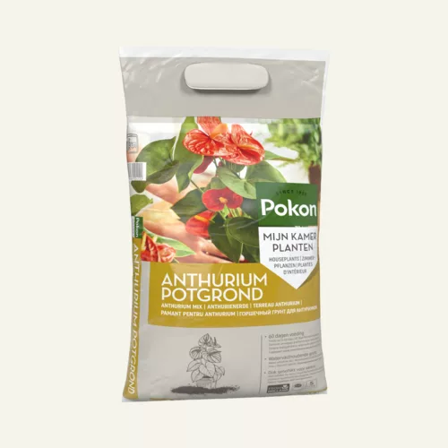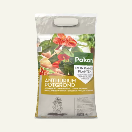 Voeding: planten in potten en in de volle grond hebben na verloop van tijd behoefte aan voeding omdat de in de grond aanwezige voedingsstoffen door de plant worden gebruikt. Deze potgrond bevat voeding voor ca. 2 maanden. Daarna adviseren wij om de planten regelmatig bij te voeden met een speciale Pokon Anthurium Voeding.