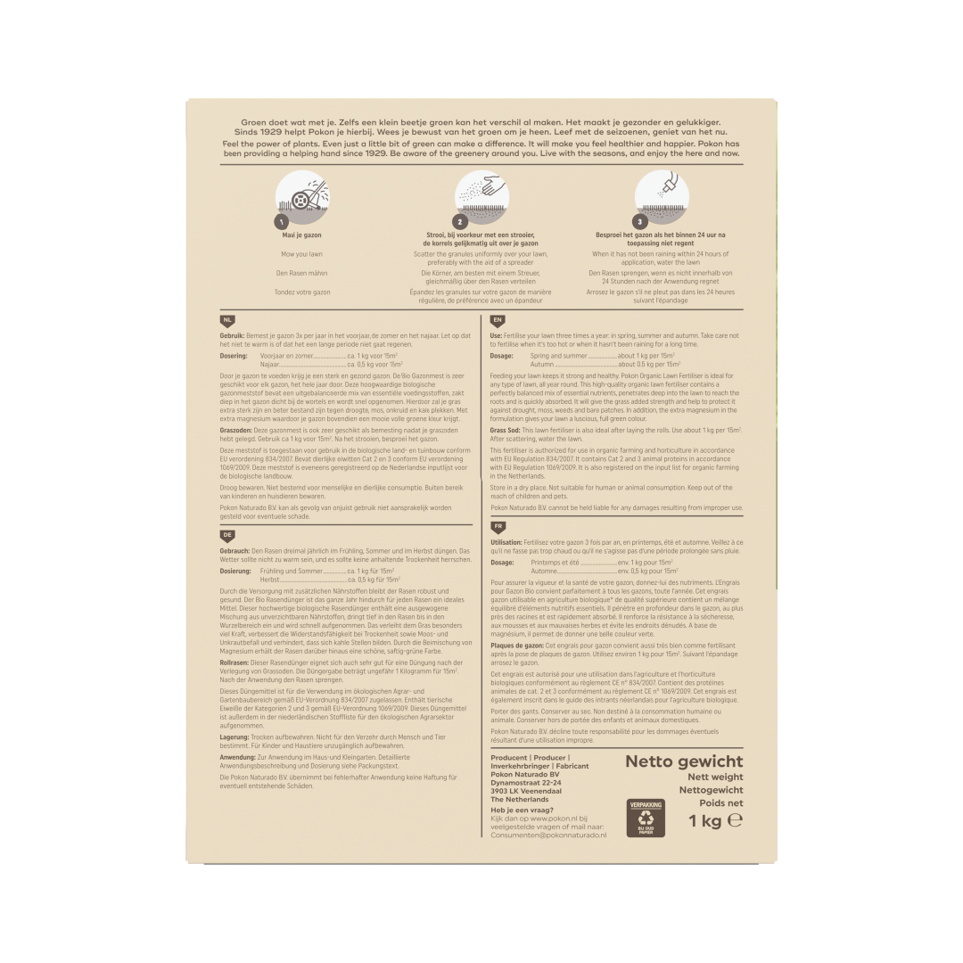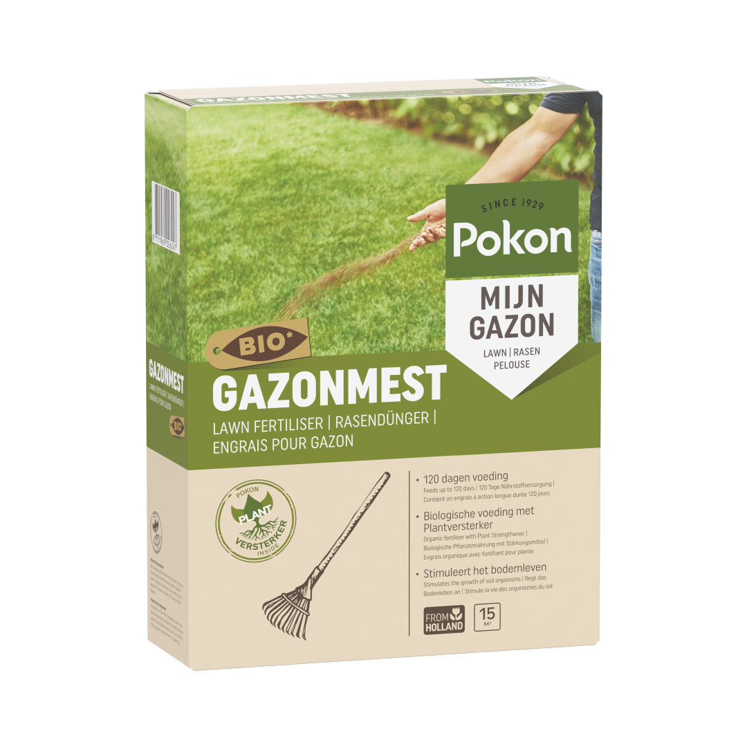 Door je gazon te voeden krijg je een sterk en gezond gazon. Pokon Bio Gazonmest is het hele jaar door geschikt voor elk gazon. Deze hoogwaardige biologische gazonmeststof bevat een uitgebalanceerde mix van essentiële voedingsstoffen. De gazonvoeding zakt diep het gazon in en komt hierdoor dicht bij de wortels die de voeding snel opnemen. Hierdoor zal je gras extra sterk zijn en beter bestand zijn tegen droogte, mos, onkruid en kale plekken. Bovendien bevat deze gazonmest extra magnesium waardoor je gazon een mooie volle groene kleur krijgt.