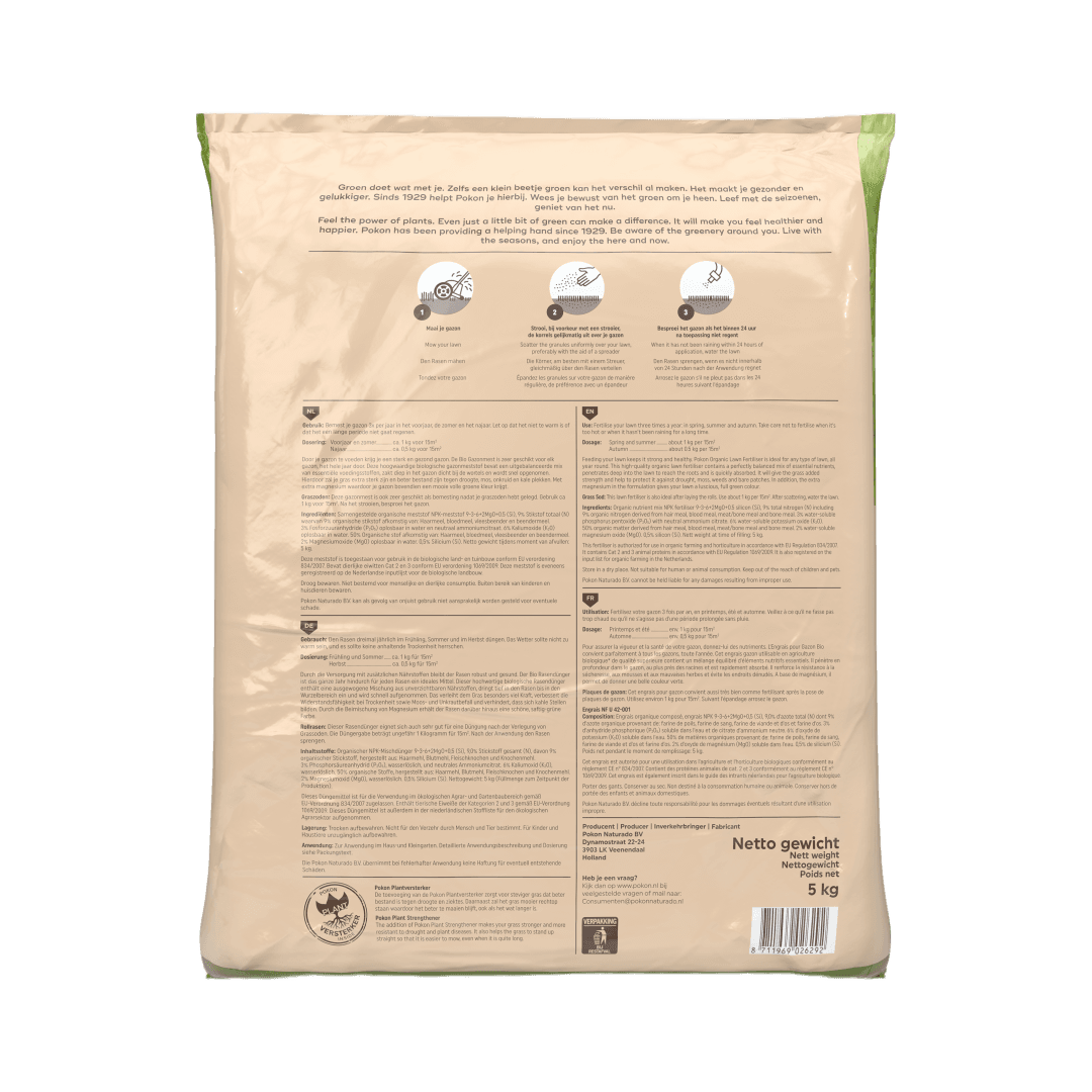 Door je gazon te voeden krijg je een sterk en gezond gazon. Pokon Bio Gazonmest is het hele jaar door geschikt voor elk gazon. Deze hoogwaardige biologische gazonmeststof bevat een uitgebalanceerde mix van essentiële voedingsstoffen. De gazonvoeding zakt diep het gazon in en komt hierdoor dicht bij de wortels die de voeding snel opnemen. Hierdoor zal je gras extra sterk zijn en beter bestand zijn tegen droogte, mos, onkruid en kale plekken. Bovendien bevat deze gazonmest extra magnesium waardoor je gazon een mooie volle groene kleur krijgt.