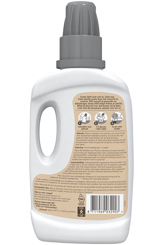 De fles van Pokon Bio Mediterrane Planten Voeding is gemaakt van 50% gereclycled plastic. Door het hergebruik van kostbare grondstoffen dragen we bij aan een groene toekomst.