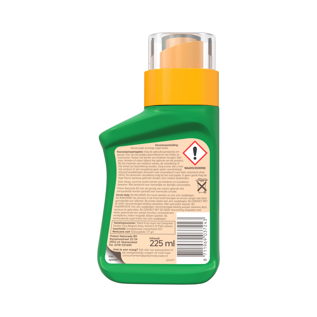 Vorstvrij en buiten bereik van kinderen en huisdieren bewaren. Niet bestemd voor menselijke en dierlijke consumptie. Pokon Evergreen B.V. kan als gevolg van onjuist gebruik niet aansprakelijk worden gesteld voor eventuele schade. Gebruik gewasbeschermingsmiddelen veilig. Lees vóór gebruik eerst het etiket en de productinformatie.