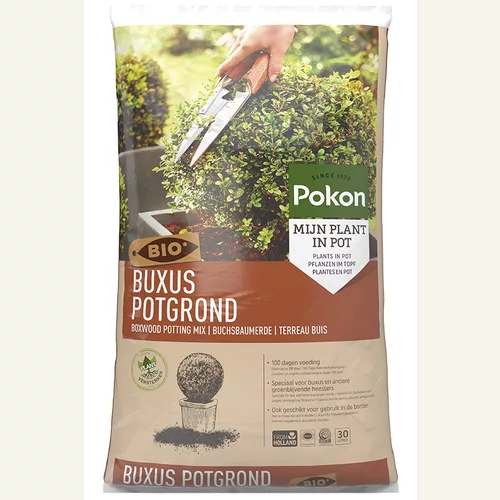 Deze biologische potgrond is ontwikkeld voor buxus planten en andere groenblijvende heesters. Pokon Bio Buxus Potgrond bestaat uit de beste en meest hoogwaardige grondstoffen zoals turfstrooisel, klei en rijstkaf. Vocht wordt beter vastgehouden door de klei en magnesium zorgt voor diepgroene bladeren en naalden. Door de toevoeging van rijstkaf krijgt de plant daarnaast beschikking over bouwstoffen die de plant sterker maken. Het gevolg is dat de planten meer weerstand krijgen tegen ziektes en plagen. Er zit voldoende biologische voeding in voor ca. 100 dagen en bovendien bevat het Pokon Plantversterker.