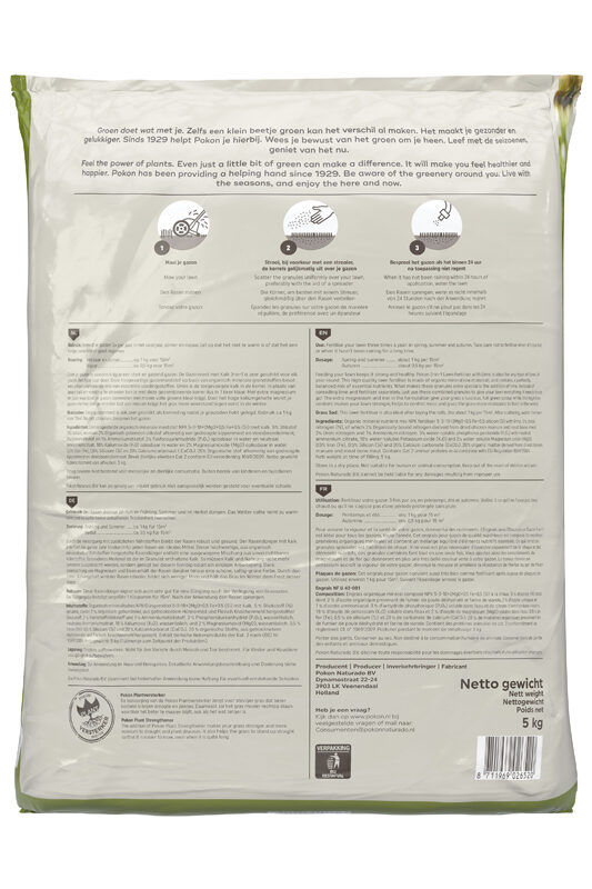 Door je gazon te voeden krijg je een sterk en gezond gazon. Pokon Gazonmest met Kalk 3-in-1 is zeer geschikt voor elk gazon, het hele jaar door. Met een keer voeden bereik je 3 acties tegelijkertijd, namelijk voeding geven, kalk strooien én sterker gras met Pokon Plantversterker