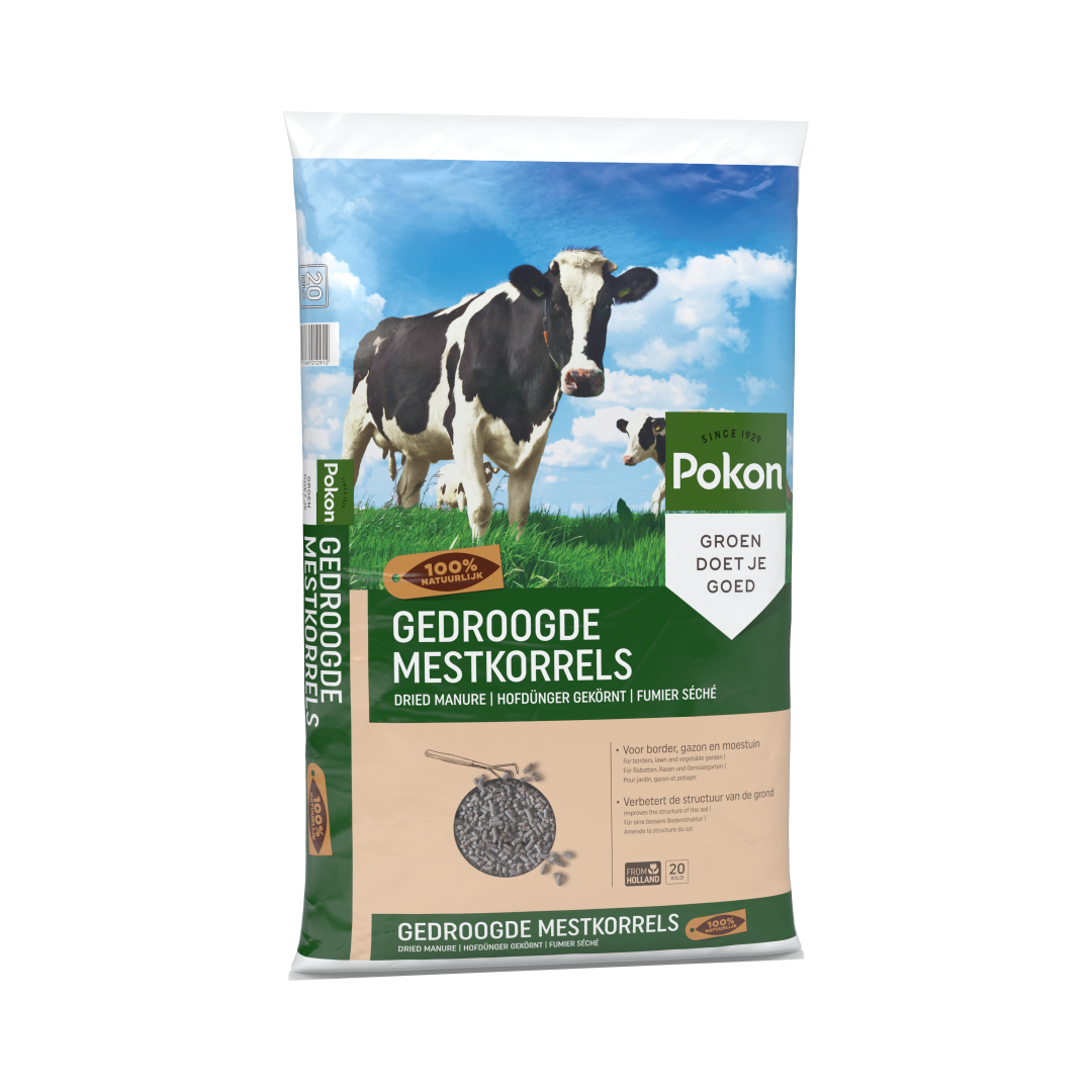 Pokon Gedroogde Mestkorrels zijn vooral gericht op bodemverbetering. Voor gerichte plantvoeding kun je combineren met Pokon plantenvoeding of specifieke meststoffen zoals Pokon Bio Tuinmest.