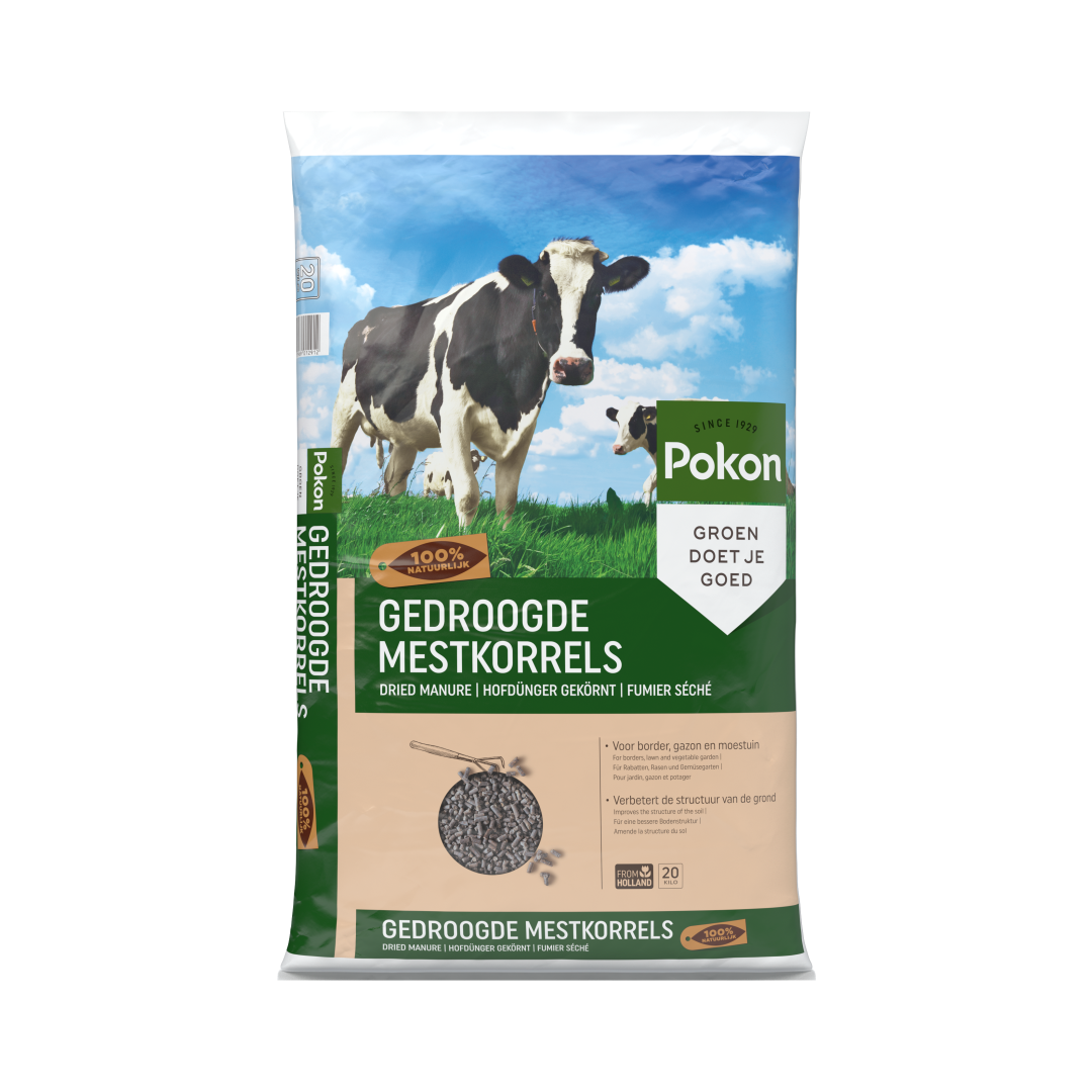 Planten in potten en in de border hebben na verloop van tijd behoefte aan voeding, omdat de in de grond aanwezige voedingsstoffen door de plant worden gebruikt. Pokon Gedroogde Mestkorrels is met name geschikt voor bodemverbetering en bevat minder voeding dan specifieke meststoffen voor de tuin. Geef je tuinplanten regelmatig voeding en je geniet een stuk langer van ze.