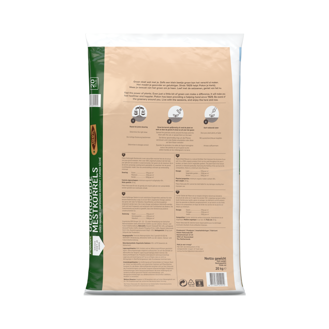 Pokon Gedroogde Mestkorrels zijn gemaakt van gedroogde dierlijke meststoffen en bevatten een hoog gehalte aan organische stof. De kans op verbranding is hierdoor minimaal.