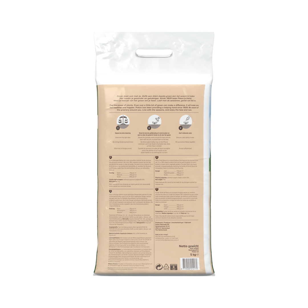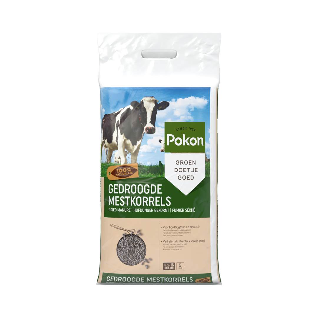 Pokon Gedroogde Mestkorrels zijn gemaakt van gedroogde dierlijke meststoffen en bevatten een hoog gehalte aan organische stof. De kans op verbranding is hierdoor minimaal.