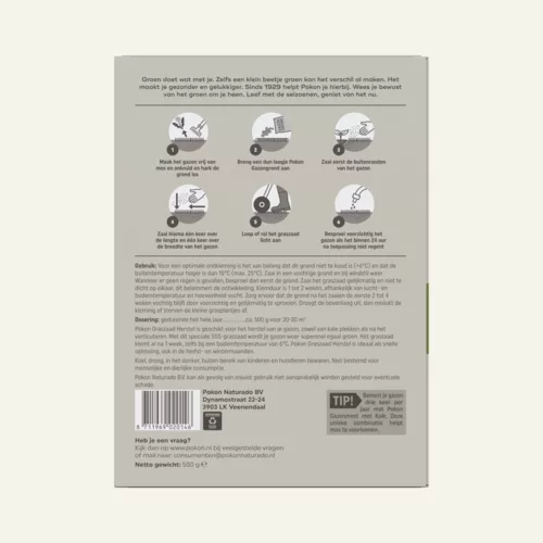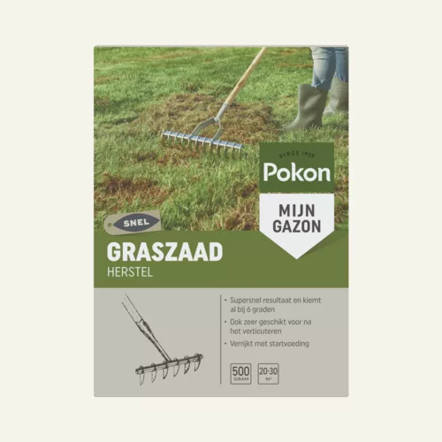 Kale plekken in je gazon kunnen ontstaan na de winter of na het verticuteren. Met Pokon Graszaad Herstel is je gazon supersnel weer egaal groen. Het graszaad kiemt al binnen 1 week, zelfs bij een bodemtemperatuur van 6°C. Je kunt Pokon Graszaad Herstel ook gebruiken voor het doorzaaien van het gazon.