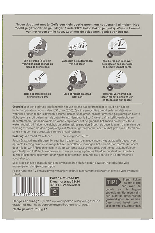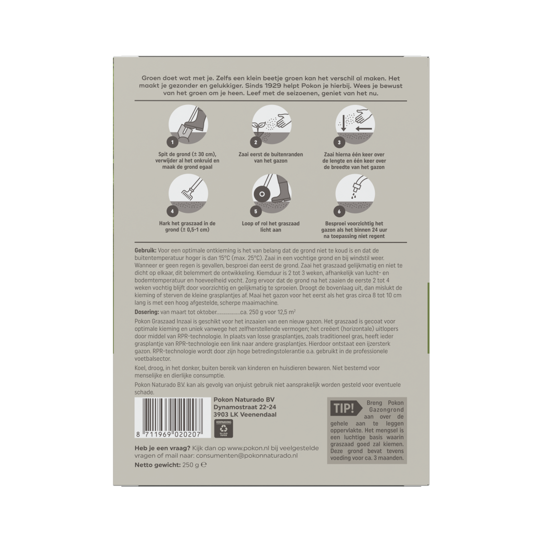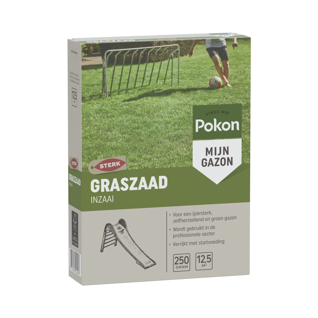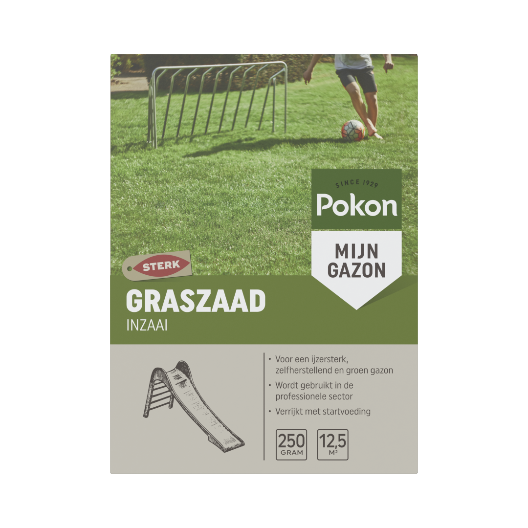 Pokon Graszaad Inzaai is geschikt voor het inzaaien van een nieuw gazon. Het graszaad is uniek vanwege het zelfherstellende vermogen; het creëert (horizontale) uitlopers door middel van RPR technologie. Hierdoor ontstaat een ijzersterk gazon. RPR wordt gebruikt in de professionele sector voor onder andere voetbalvelden en heeft een hoge betredingstolerantie. Graszaad Inzaai met RPR is uniek op de consumentenmarkt!