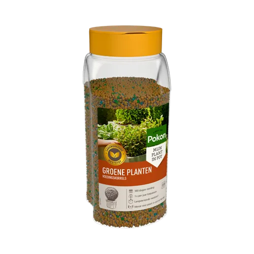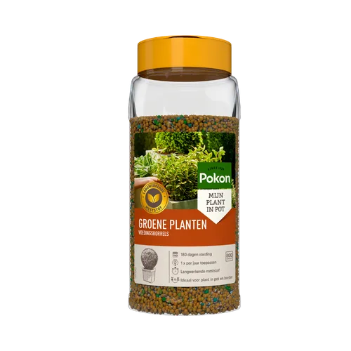 Pokon Groene Planten Voedingskorrels hebben een samengestelde meststof NPK 15-10-12 + 2MgO + Micronutriënten.