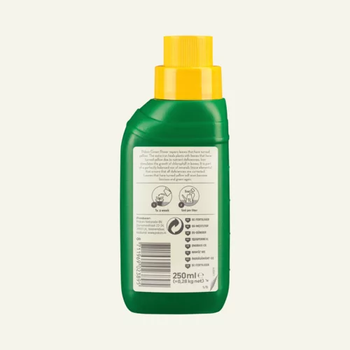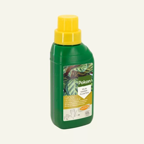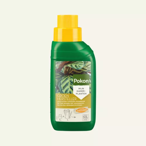 Wanneer bladeren van je plant geel worden, kan dit een gevolg zijn van een tekort aan voedingsstoffen. Pokon Groenhersteller met extra ijzer bevat een rijke mix aan sporenelementen. Deze unieke samenstelling geeft intensieve verzorging aan planten die als gevolg van een tekort aan sporenelementen vergeeld zijn. Vergeelde bladeren zullen na de behandeling zichtbaar opknappen. Bladeren die zijn aangetast door ziektes en plagen en die al bruin zijn geworden, worden niet hersteld.
