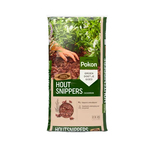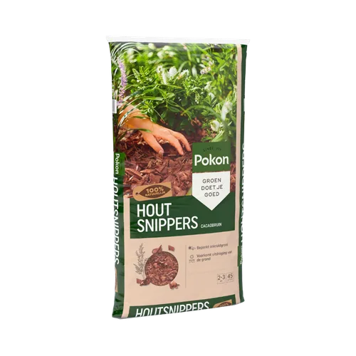 Pokon Houtsnippers Cacaobruin 45L is een natuurlijke bodembedekker van gekleurd hout, afkomstig uit duurzaam beheerde bossen. Een duurzaam en milieuvriendelijk product.